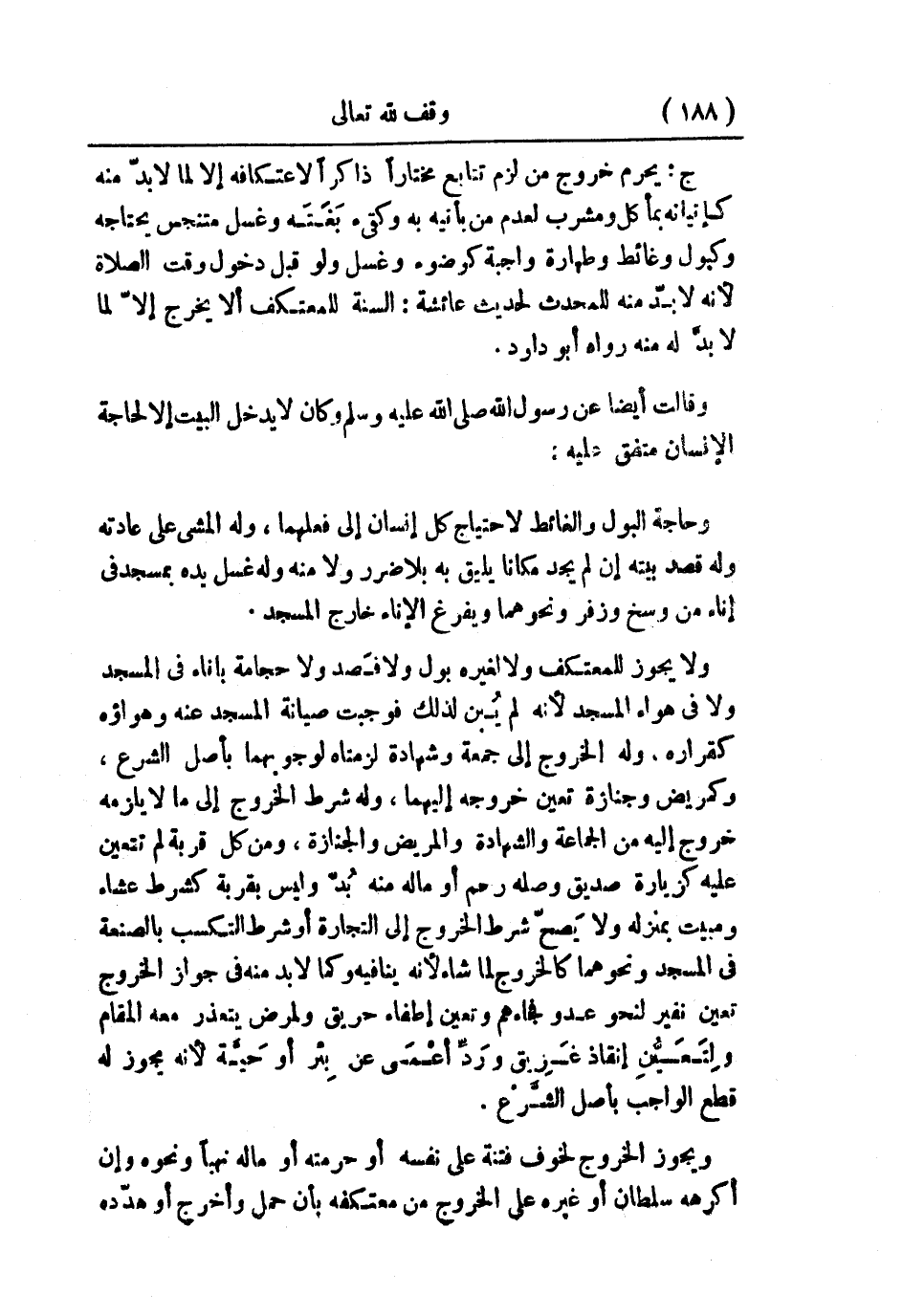 وحاجة البول والغائط لاحتياج كل إنسان إلى فعلهما، وله المشي على عادته وله قصد بيته إن لم يجد مكانًا يليق به بلا ضرر ولا منه وله غسل يده بمسجد في إناء من وسخ وزفر ونحوهما ويفرغ الإناء خارج المسجد.