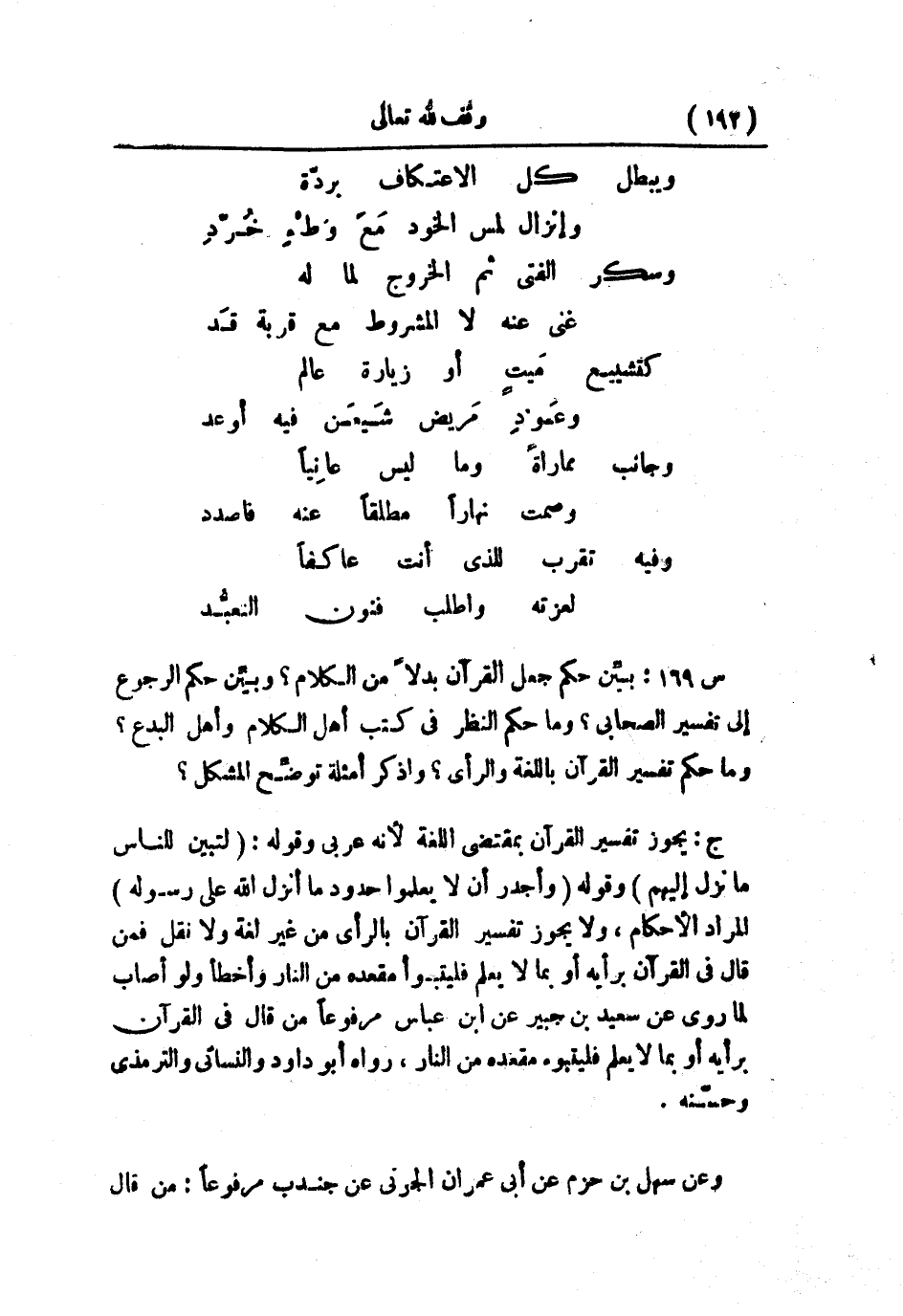 س171: بيِّن حكم جعل القرآن بدلاً من الكلام؟ وبيِّن حكم الرجوع إلى تفسير الصحابي؟ وما حكم النظر في كتب أهل الكلام وأهل البدع؟ وما حكم تفسير القرآن باللغة والرأي؟ واذكر أمثلة توضَّح المشكل.