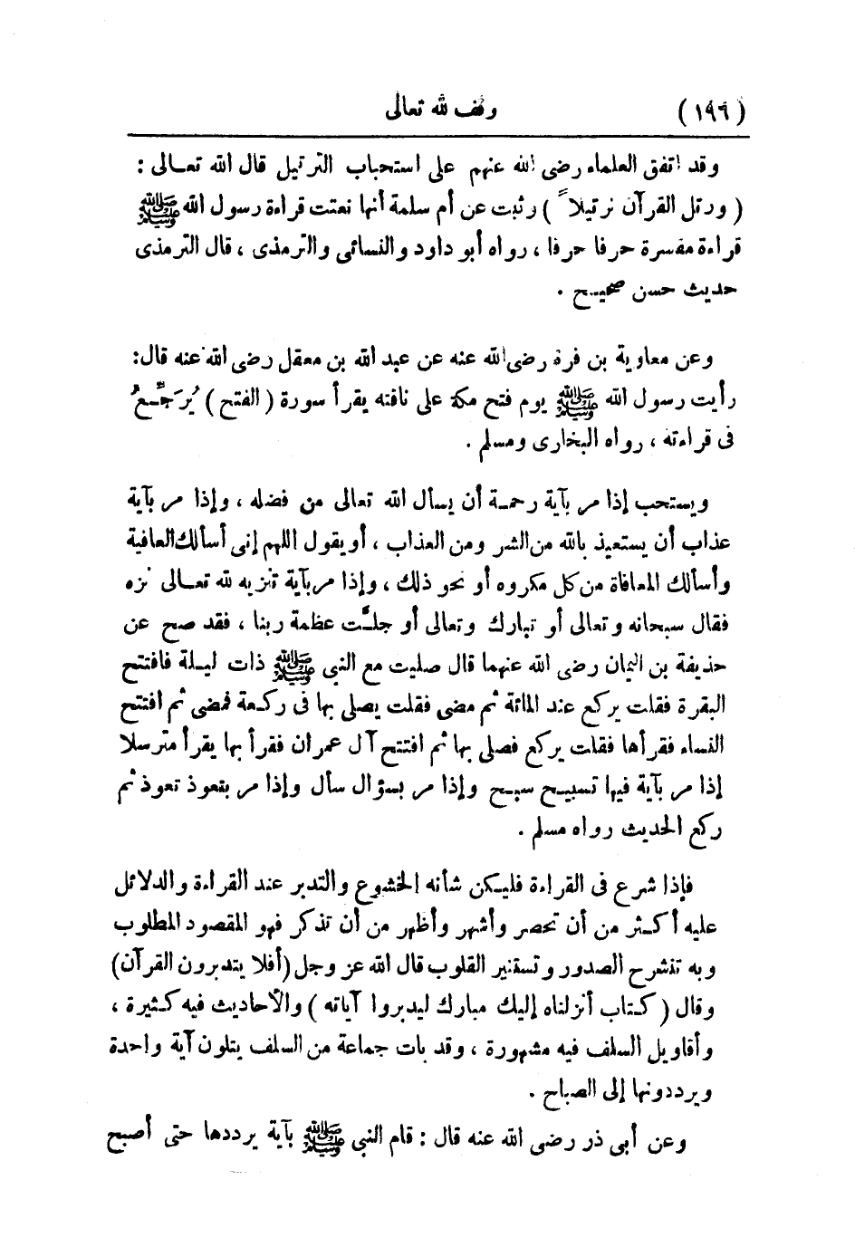 وقد اتفق العلماء - رضي الله عنهم - على استحباب الترتيل، قال الله تعالى: {وَرَتِّلِ القُرْآنَ تَرْتِيلاً} ، وثبت عن أم سلمة أنها نعتت قراءة رسول الله - صلى الله عليه وسلم - قراءة مفسرة حرفًا حرفًا، رواه أبو داود والنسائي والترمذي، قال الترمذي: حديث حسن صحيح.