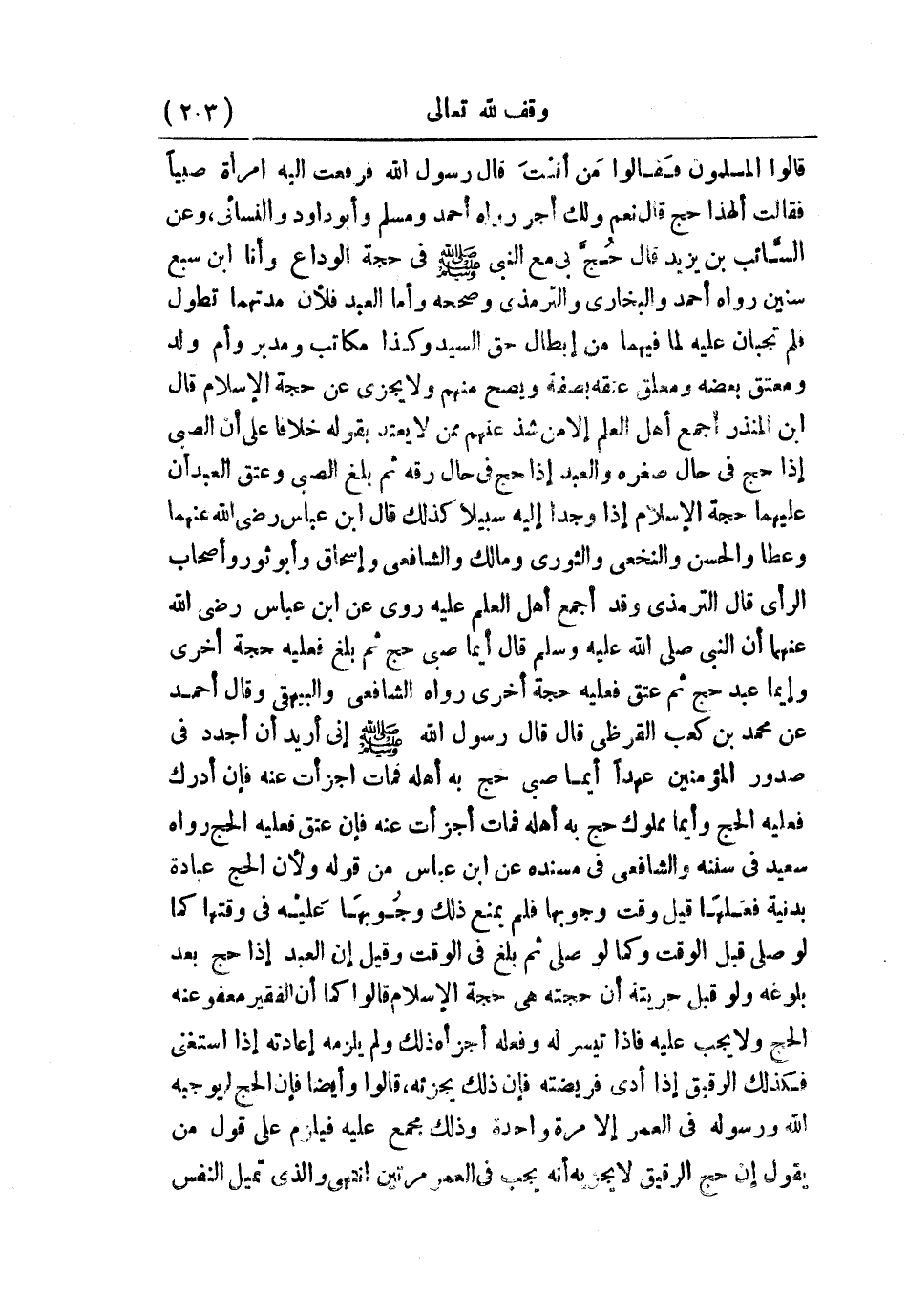 قالوا: المسلمون، فقالوا: مَن أنْتَ، قال: «رسول الله» ، فرفعت إليه امرأة صبيًا، فقالت: ألهذا حج، قال: «نعم، ولك أجر» رواه أحمد ومسلم وأبو داود والنسائي، وعن السائب بن يزيد قال: حُجَّ بي مع النبي - صلى الله عليه وسلم - في حجة الوداع وأنا ابن سبع سنين، رواه أحمد والبخاري والترمذي، وصححه؛ وأما العبد فلأن مدتهما تطول فلم تجبان عليه لما فيهما من إبطال حق السيد، وكذا مكاتب ومدبر وأم ولد ومعتق بعضها ومعلق عنقه بصفة ويصح منهم ولا يجزي عن حجة الإسلام، قال ابن المنذر: أجمع أهل العلم إلا من شذ عنهم ممن لا يعتد قوله خلافًا على أن الصبي إذا حج في حال صغره والعبد إذا حج في حال رقه ثم بلغ الصبي وعتق العبدان عليهما حجة الإسلام إذا وجدا إليه سبيلاً، كذلك قال ابن عباس - رضي الله عنهما - وعطا والحسن والنخعي والثوري ومالك والشافعي وإسحاق وأبو ثور وأصحاب الرأي، قال الترمذي: وقد أجمع أهل العلم عليه، روي عن ابن عباس - رضي الله عنهما - أن النبي - صلى الله عليه وسلم - قال: «أيما صبي حج، ثم بلغ فعليه حجة أخرى، وإيما عبد حج ثم عتق فعليه حجة أخرى» رواه الشافعي والبيهقي، وقال أحمد عن محمد بن كعب القرظي، قال: قال رسول الله - صلى الله عليه وسلم -: «إني أريد أن أجدد في صدور المؤمنين عهدًا، أيما صبي حج به أهله فمات أجزأت عنه؛ فإن أدرك فعليه الحج، وأيما مملوك حج به أهله فمات أجزأت عنه؛ فإن عتق فعليه الحج» رواه سعيد في «سننه» ، والشافعي في «مسنده» عن ابن عباس من قوله؛ ولأن الحج عبادة بدنية فعَلهَا، قيل: وقت وجوبها فلم يمنع ذلك وجُوبهَا عَليْه في وقتها كما لو صلى قبل الوقت، وكما لو صلى ثم بلغ في الوقت، وقيل: إن العبد إذا حج بعد بلوغه، ولو قبل حريته أن حجته هي حجة الإسلام، قالوا: كما أن الفقير معفوعنه الحج ولا يجب عليه؛ فإذا تيسر له وفعله أجزأه ذلك ولم يلزمه إعادته إذا استغنى فكذلك الرقيق إذا أدى فريضته؛ فإن ذلك يجزئه، قالوا: وأيضًا فإن الحج يوجبه الله ورسوله في العمر إلا مرة واحدة، وذلك مجمع عليه فيلزم على قول من يقول إن حج الرقيق لا يجزيه أنه يجب في العمر مرتين. انتهى والذي تميل النفس