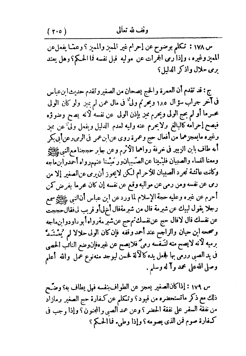 ج: قد تقدم أن العمرة والحج يصحان من الصغير وتقدم حديث ابن عباس في آخر جواب سؤال 185 ويحرمُ وليٌّ في مال عمن لم يميز ولو كان الولي محرمًا أو لم يحج الولي ويحرم مميز بإذن الولي عن نفسه؛ أنه يصح وضوؤه فيصح إحرامه كالبالغ ولا يحرم عنه وليه لعدم الدليل ويفعل وليُّ عن مميز وغيره ما يعجزهما من أفعال حج وعمرة. روي عن ابن عمر في الرمي وعن أبي بكر أنه طاف بابن الزبير في خرقة رواهما الأثرم، وعن جابر: حججنا مع النبي - صلى الله عليه وسلم - ومعنا النساء والصبيان فلبْينا عن الصّبيان ورمَيْنا عنهم، رواه أحمد وابن ماجه. وكانت عائشة تجرد الصبيان للإحرام؛ لكن لا يجوز أن يرمي عن الصغير إلا من رمى عن نفسه، ومن رمى عن مواليه وقع عن نفسه، إن كان محرمًا بفرض كمن أحرم عن غيره وعليه حجة الإسلام؛ لما ورد عن ابن عباس: أن النبي - صلى الله عليه وسلم - سمع رجلاً يقول لبيك عن شبرمة، قال: «من شبرمة؟» قال: أخ لي أو قريب لي، فقال: «حججت عن نفسك؟» قال: لا، قال: «حج عن نفسك، ثم حج عن شبرمة» رواه أبو داود وابن ماجه وصححه ابن حبان، والراجح عند أحمد وقفه؛ فإن كان الولي حلالاً لم يُعْتَدَّ برميه؛ لأنه لا يصح منه لنَفسه رميٌ فلا يصح عن غيره؛ فإن وضع النائب الحصى في يد الصبي ورمى بها فجع ليده كالآلة فحسن ليوجد منه نوع عمل. والله أعلم، وصلى الله على محمد وآله وسلم.