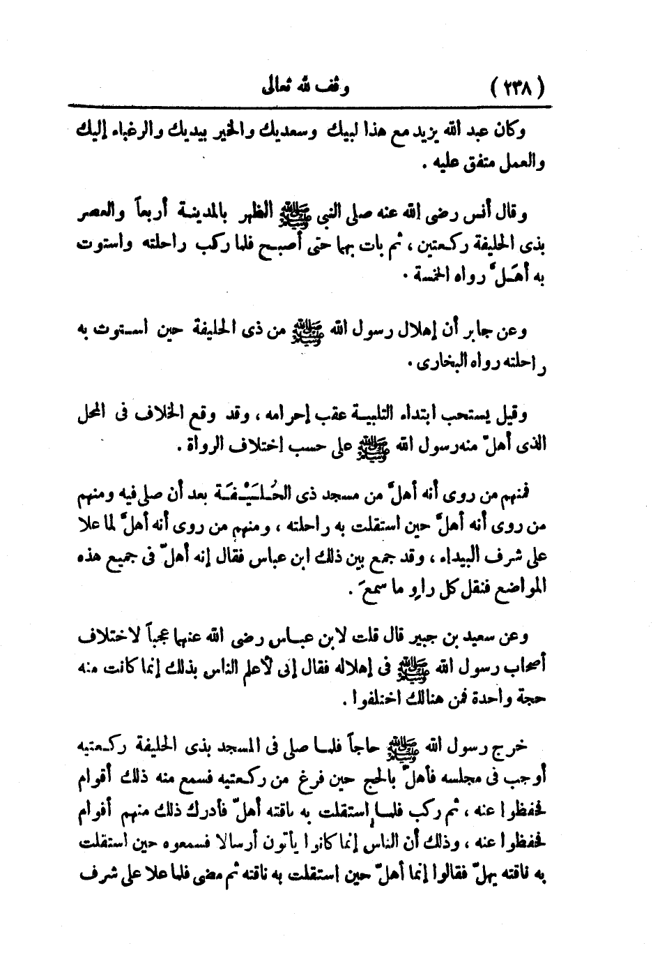 وقال أنس - رضي الله عنه -: «صلى النبي - صلى الله عليه وسلم - الظهر بالمدينة أربعًا، والعصر بذي الحليفة ركعتين، ثم بات بهما حتى أصبح، فلما ركب راحلته واستوت به، أهَلَّ» رواه الخمسة.