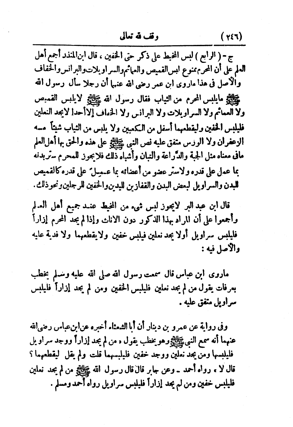 وفي رواية عن عمرو بن دينار أن أبا الشعثاء أخبره عن ابن عباس رضي الله عنهما أنه سمع النبي - صلى الله عليه وسلم - وهو يخطب يقول: «من لم يجد إزارًا ووجد سراويل فليلبسها، ومن يجد نعلين ووجد خفين فليلبسهما» ، قلت: ولم يقل ليقطعهما؟ قال: لا» رواه أحمد. وعن جابر قال: قال رسول الله - صلى الله عليه وسلم -: «من لم يجد نعلين فليلبس خفين، ومن لم يجد إزارًا فليلبس سراويل» رواه أحمد ومسلم.