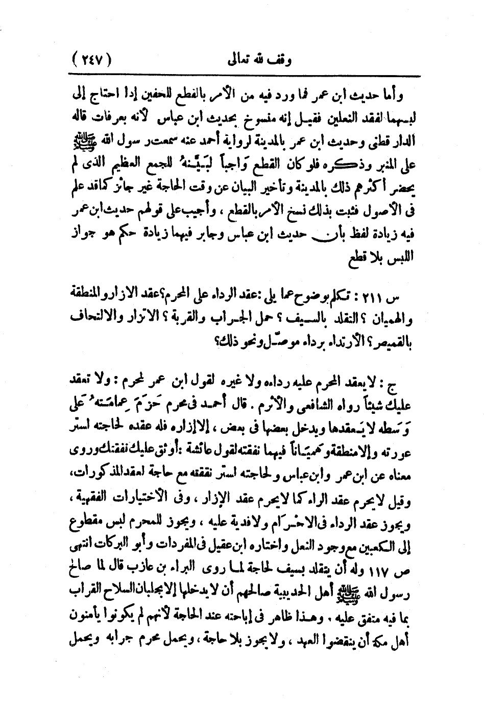 ج: لا يعقد المحرم عليه رداءه ولا غيره؛ لقول ابن عمر لمحرم: «ولا تعقد عليك شيئًا» رواه الشافعي والأثرم. قال أحمد في محرم حَزَمَ عِمامَتهُ عَلى وَسَطه لا يعقدها ويدخل بعضها في بعض، إلا إزاره فله عقده لحاجته لستر وَسَطه لا يَعقدها ويدخل بعضها في بعض، إلا إزاره فله عقده لحاجته لستر عورته وإلا منطقة وهَميَانًا فيهما نفقته؛ لقول عائشة: أوثق عليك نفقتك، وروى معناه عن ابن عمر وابن عباس ولحاجته لستر نفقته مع حاجة لعقد المذكورات، وقيل: لا يحرم عقد الراء كما لا يحرم عقد الإزار. وفي «الاختيارات الفقهية» : ويجوز عقد الرداء في الإحْرَام ولا فدية عليه، ويجوز للمحرم لبس مقطوع إلى الكعبين مع وجود النعل، واختاره ابن عقيل في المفردات وأبو البركات. انتهى (ص117) ، وله أن يتقلد بسيف لحاجة؛ لما روى البراء بن عازب قال: لما صالح رسول الله - صلى الله عليه وسلم - أهل الحديبية صالحهم أن لا يدخلها إلا يجلبان السلاح القراب بما فيه، متفق عليه. وهذا ظاهر في إباحته عند الحاجة؛ لأنهم لم يكونوا يأمنون أهل