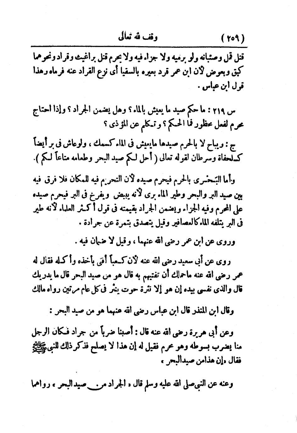 وقال ابن المنذر: قال ابن عباس - رضي الله عنهما ـ: هو من صيد البحر، وعن أبي هريرة - رضي الله عنه - قال: أصبنا ضربًا من جراد فكان الرجل منا يضرب بسوطه وهو محرم، فقيل له: إن هذا لا يصلح، فذكر ذلك للنبي - صلى الله عليه وسلم -، فقال: «إن هذا من صيد البحر» .