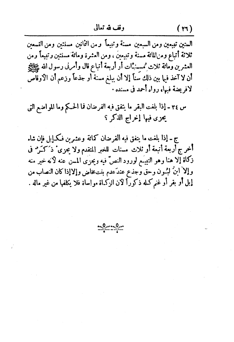 ج: إذا بلغت ما يتفق فيه الفرضان كمائة وعشرين فكإبل؛ فإن شاء أخرج أربعة أتبعة أو ثلاث مسنات للخبر المتقدم ولا يجزئ ذَكَرٌ في زكاة إلا هنا وهو التبيع لورود النصّ فيه ويجزي المسن عنه؛ لأنه خير منه وإلا ابنُ لبُون وحق وجذع عندَ عدم بنت مخاض، وإلا إذا كان النصاب من إبل أو بقر أو غنم كله ذكورًا؛ لأن الزكاة مواساة فلا يكلفها من غير ماله.