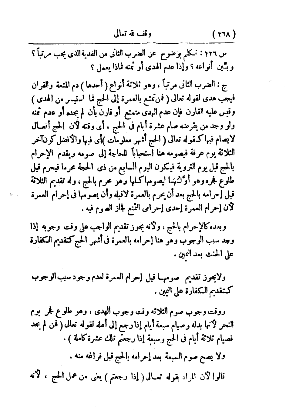 ج: الضرب الثاني مرتبًا، وهو ثلاثة أنواع: أحدها: دم المتعة والقران فيجب هدي؛ لقوله تعالى: {فَمَن تَمَتَّعَ بِالْعُمْرَةِ إِلَى الحَجِّ فَمَا اسْتَيْسَرَ مِن الهَدْيِ} وقيس عليه القارن؛ فإن عدم الهدي متمتع أو قارن بأن لم يجده أو عدم ثمنه ولو وجد من يقرضه صام عشرة أيام في الحج، أي وقته؛ لأن الحج أفعال لا يصام فيها كقوله تعالى: {الْحَجُّ أَشْهُرٌ مَّعْلُومَاتٌ} أي فيها، والأفضل كون أخر الثلاثة يوم عرفة فيصومه هنا استحبابًا للحاجة إلى صومه ويقدم الإحرام بالحج قبل يوم التروية فيكون اليوم السابع من ذي الحجة محرمًا فيحرم قبل طلوع فجره وهو أوَّلُهَما ليصومها كلها وهو محرم بالحج، وله تقديم الثلاثة قبل إحرامه بالحج بعد أن يحرم بالعمرة لا قبله وأن يصومها في إحرام العمرة؛ لأن إحرام العمرة إحدى إحرامي التمتع فجاز الصوم فيه.