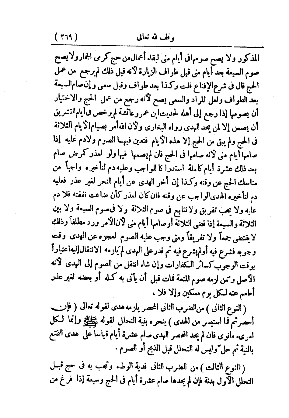 المذكور ولا يصح صومها في أيام منى لبقاء أعمال من حج كرمي الجمار، ولا يصح صوم السبعة بعد أيام منى قبل طواف الزيارة؛ لأنه قبل ذلك لم يرجع من عمل الحج. قال في «شرح الإقناع» : قلت: وكذا بعد طواف، وقيل: سعي وإن صام السبعة بعد الطواف، ولعل المراد والسعي يصح؛ لأنه رجع من عمل الحج والاختيار أن يصومها إذا رجع إلى أهله؛ لحديث ابن عمر وعائشة لم يرخص في أيام التشريق أن يصمن إلا لمن يجد الهدي، رواه البخاري. ولأن الله أمر بصيام الأيام الثلاثة في الحج ولم يبق من الحج إلا هذه الأيام، فتعين فيها الصوم ولا دم عليه إذا صامها أيام منى؛ لأنه صامها في الحج؛ فإن لم يصمها فيها ولو لعذر كمرض صام بعد ذلك عشرة أيام كاملة استدراكًا للواجب وعليه دم لتأخيره واجبًا من مناسك الحج عن وقته، وكذا إن أخر الهدي عن أيام النحر لغير عذر، فعليه دم لتأخيره الهدي الواجب عن وقته؛ فإن كان لعذر كأن ضاعت نفقته، فلا دم عليه ولا يجب تفريق ولا تتابع في صوم الثلاثة، ولا في صوم السبعة ولا بين الثلاثة والسبعة إذا قضى الثلاثة أو صامها أيام منى؛ لأن الأمر ورد مطلقًا، وذلك لا يقتضي جمعًا ولا تفريقًا ومتى وجب عليه الصوم لعجزه عن الهدي وقت وجوبه فشرع فيه أو لم يشرع فيه، ثم قدر على الهدي لم يَلزمه الانتقال إليه اعتبارًا بوقت الوجوب كسائر الكفارات وإن شاء انتقل من الصوم إلى الهدي؛ لأنه الأصل ومَن لزمه صوم المتعة فمات قبل أن يأتي به كله أو بعضه لغير عذر أطعم عنه لكل يوم مسكين وإلا فلا.