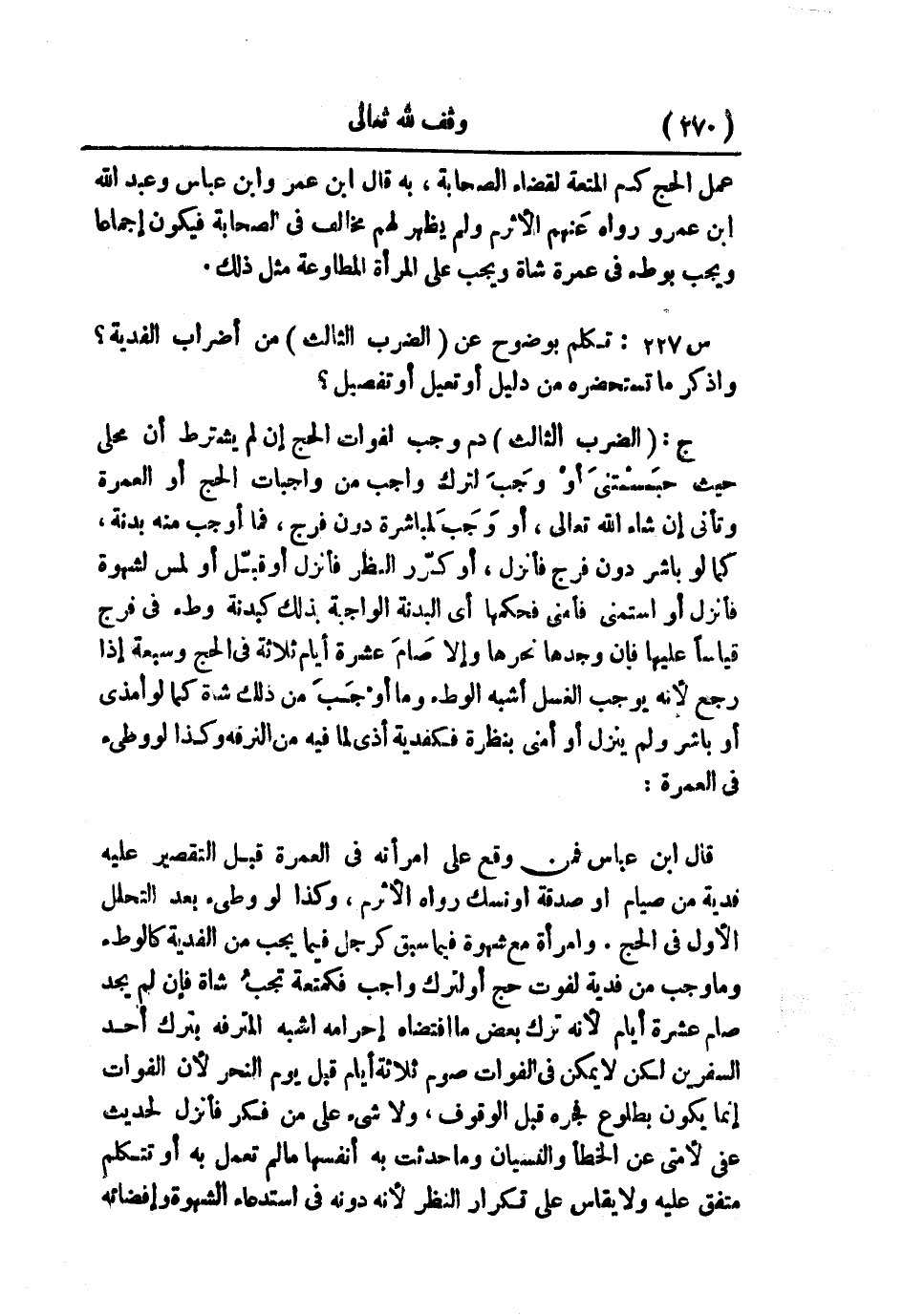 قال ابن عباس: فمن وقع على امرأته في العمرة قبل التقصير عليه فدية من صيام أو صدقة أو نسك، رواه الأثرم. وكذا لو وطئ بعد التحلل الأول في الحج. وامرأة مع شهوة فيما سبق كرجل فيما يجب من الفدية كالوطء وما وجب من فدية لفوت حج أو لترك واجب فكمتعة تجبُ شاة؛ فإن لم يجد صام عشرة أيام؛ لأنه ترك بعض ما اقتضاه إحرامه أشبه المترفه بترك أحد السفرين؛ لكن لا يمكن في الفوات صوم ثلاثة أيام قبل يوم النحر؛ لأن الفوات إنما يكون بطلوع فجره قبل الوقوف، ولا شيء على من فكر فأنزل؛ لحديث: «عفي لأمتي عن الخطأ والنسيان وما حدثت به أنفسها ما لم تعمل به أو تتكلم» متفق عليه. ولا يقاس على تكرار النظر؛ لأنه دونه في استدعاء الشهوة وإفضائه