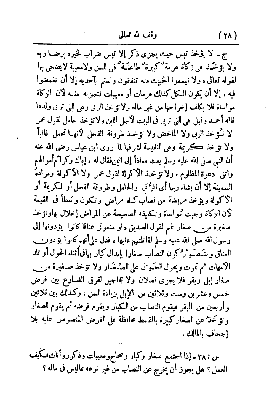 ج: لا يؤخذ تيس حيث يجزي ذكر إلا تيس ضراب لخيره برضا ربه ولا يؤخَذ في زكاة هرمةٌ كبيرةٌ طاعنةٌ في السن ولا معيبة ولا يضحي بها؛ لقوله تعالى: {وَلاَ تَيَمَّمُوا الخَبِيثَ مِنْهُ تُنفِقُونَ وَلَسْتُم بِآخِذِيهِ إِلاَّ أَن تُغْمِضُوا فِيهِ} إلا أن يكو الكل كذلك هو مات أو معيبات فتجزيه منه؛ لأن الزكاة مواساة فلا يكلف إخراجها من غير ماله ولا تؤخذ الربى وهي التي تربي ولدها، قاله أحمد، وقيل: هي التي تربى في البيت لأجل اللبن ولا تؤخذ حامل لقول عمر لا تُؤخذ الربى ولا الماخض ولا تؤخذ طروقة الفحل؛ لأنها تحمل غالبًا ولا تؤخذ كريمة وهي النفيسة لشرفها؛ لما روى بن عباس - رضي الله عنه - أن النبي - صلى الله عليه وسلم - بعث معاذًا إلى اليمن، فقال له: «إياك وكرائم أموالهم، واتق دعوة المظلوم» ، ولا تؤخذ الأكولة؛ لقول عمر، ولا الأكولة ومراده السمينة إلا أن يشاء ربها أي الرُّبَى، والحامل وطروقة الفحل أو الكريمة أو الأكولة، ويؤخذ مريضة من نصاب كله مراض وتكون وسطًا في القيمة؛ لأن الزكاة وجبت مُواساة وتكليفه الصحيحة عن المراض إخلال بها وتؤخذ صغيرة من صغار غنم لقول الصديق: «لو منعوني عناقًا كانوا يؤدونها إلى رسول الله - صلى الله عليه وسلم - لقاتلتهم عليها» فدل على أنهم كانوا يؤدون العناق وبتَصوَّرُ كون النصاب صغارًا بإبدال كبار بها في أثناء الحول أو تلد الأمهات ثم تموت ويحول الحَوْل على الصِّغَار ولا تؤخذ صغيرة من صغار إبل وبقر، فلا يجزي فصلان ولا عجاجيل لفرق الشارع بين فرض خمس وعشرين وست وثلاثين من الإبل بزيادة السن، وكذلك بين ثلاثين وأربعين من البقر فيقوم النصاب من الكبار ويقوم فرضه ثم يقوم الصغار وتؤخذُ عن الصغار كبيرة بالقسط محافظة على الفرض المنصوص عليه بلا إجحاف المالك.