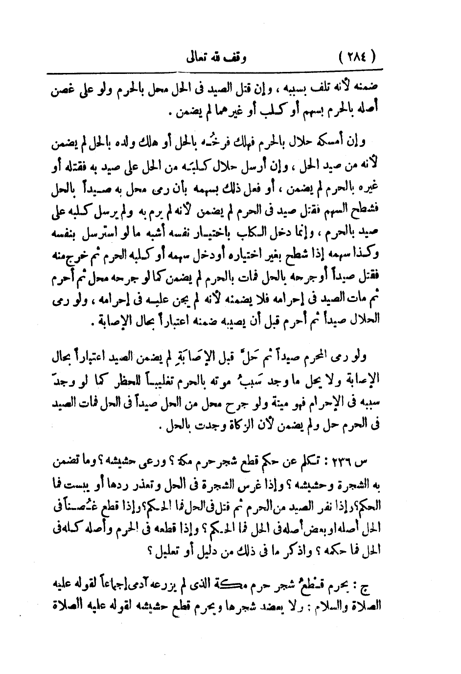 س238: تكلم عن حكم قطع شجر حرم مكة؟ ورعي حشيشه؟ وما تضمن به الشجرة وحشيشه؟ وإذا غرس الشجرة في الحل وتعذر ردها أو يبست فما الحكم؟ وإذا نفر الصيد من الحرم ثم قتل في الحِل، فما الحكم؟ وإذا قطع غُصنًا في الحل أصله أو بعض أصله في الحل، فما الحكم؟ وإذا قطعه في الحرم وأصله كله في الحل، فما حكمه؟ واذكر ما في ذلك من دليل أو تعليل؟