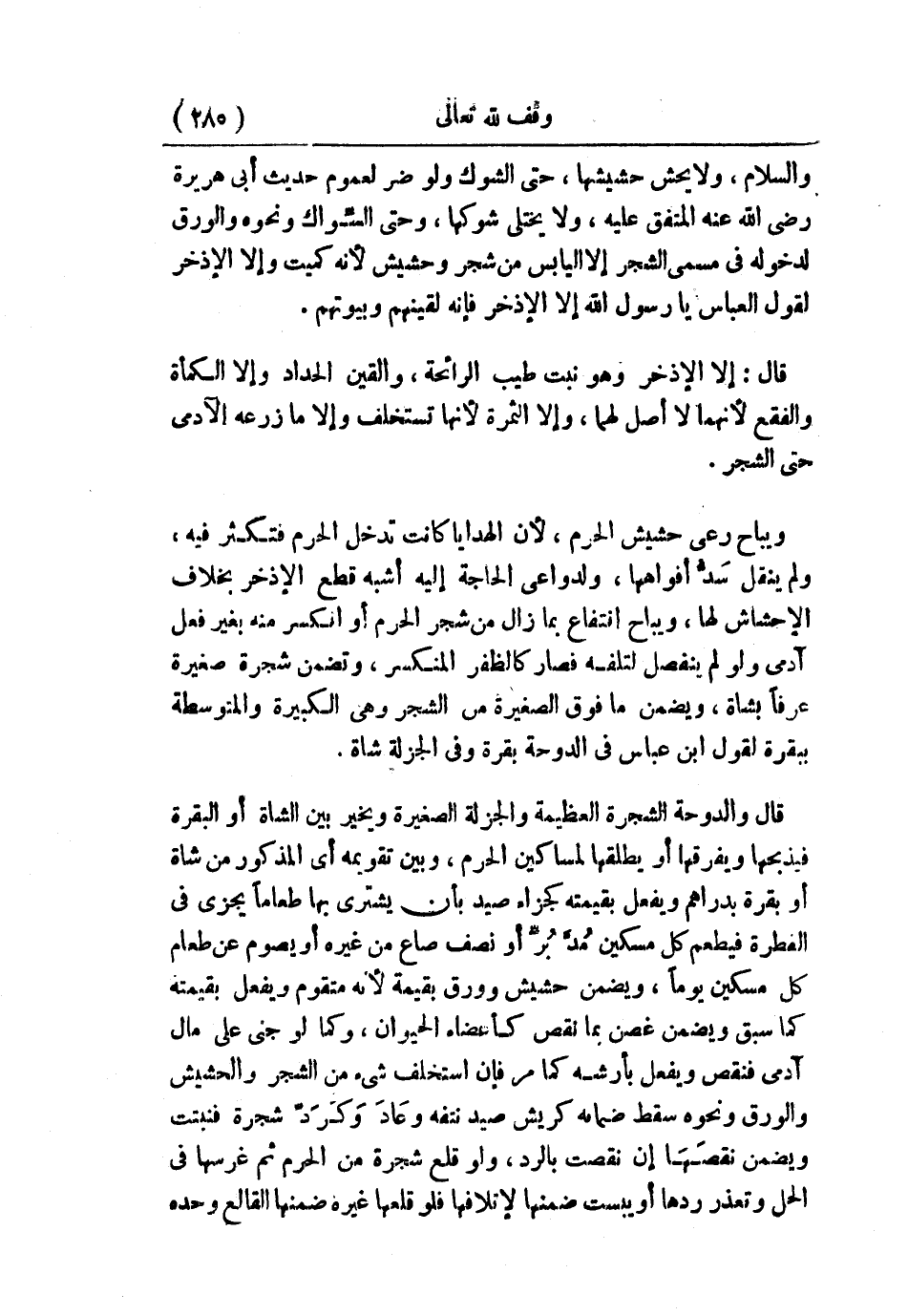 والسلام-: «ولا يحش حشيشها» ، حتى الشوك ولو ضر؛ لعموم حديث أبي هريرة - رضي الله عنه - المتفق عليه: «ولا يختلي شوكها» ، وحتى السواك ونحوه والورق لدخوله في مسمى الشجر إلا اليابس من شجر وحشيش؛ لأنه كميت وإلا الإذخر لقول العباس: يا رسول الله، إلا الإذخر؛ فإنه لقينهم وبيوتهم.