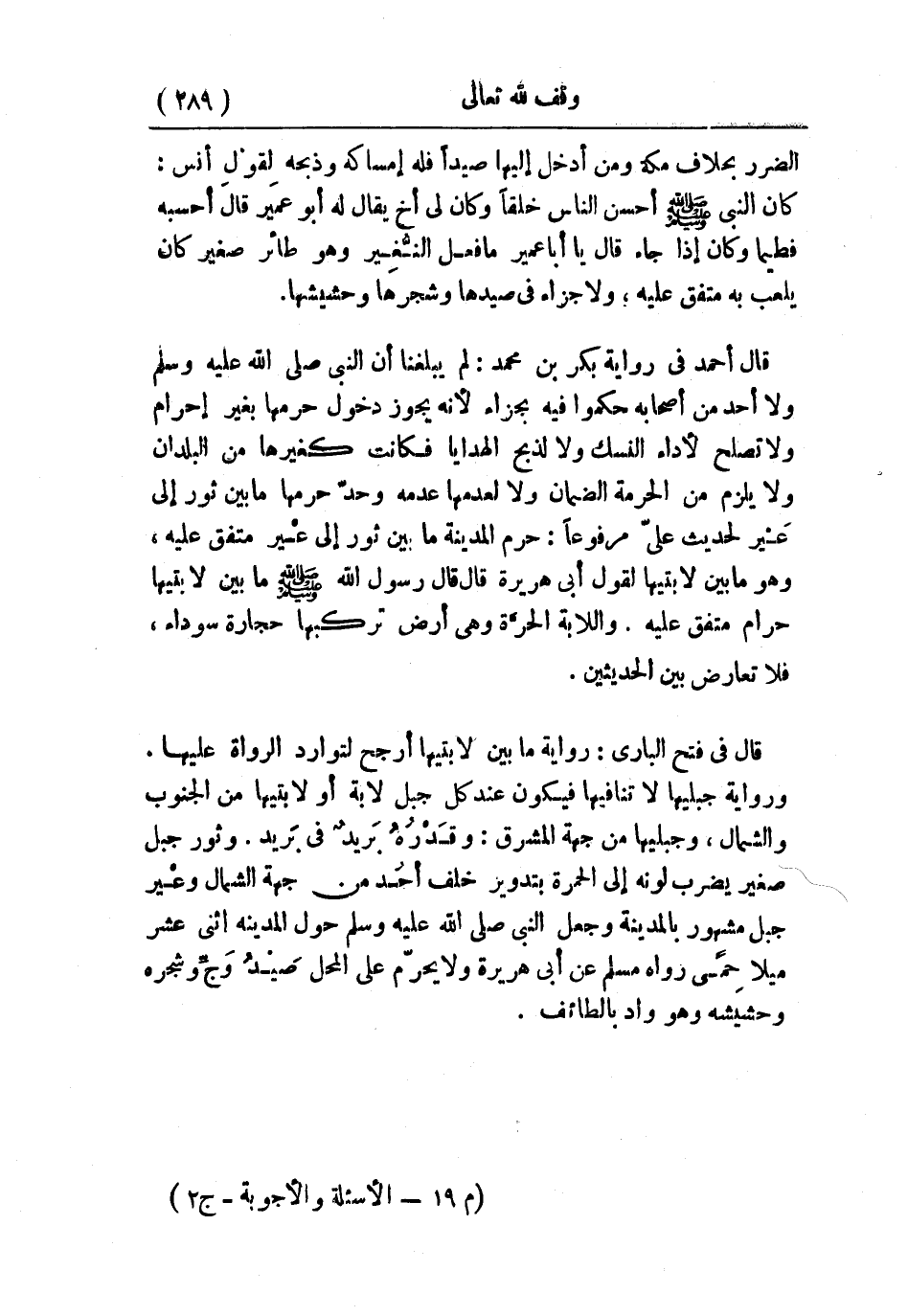 قال في «فتح الباري» : رواية ما بين لابتيها أرجح لتوارد الرواة عليها، ورواية جبليها لا تنافيها فيكون عند كل جبل لابة أو لابتيها من الجنوب والشمال، وجبليها من جهة المشرق: وقَدْرُهُ بَريدٌ في بَريد. وثور رجل صغير يضرب لونه إلى الحمرة بتدوير خلف أحُد من جهة الشمال، وعير جبل مشهور بالمدينة، «وجعل النبي - صلى الله عليه وسلم - حول المدينة أثنى عشر ميلاً حمًى» رواه مسلم عن أبي هريرة، ولا يحرّم على المحل صَيْدُ وَجٍّ وشجره وحشيشه وهو واد بالطائف.