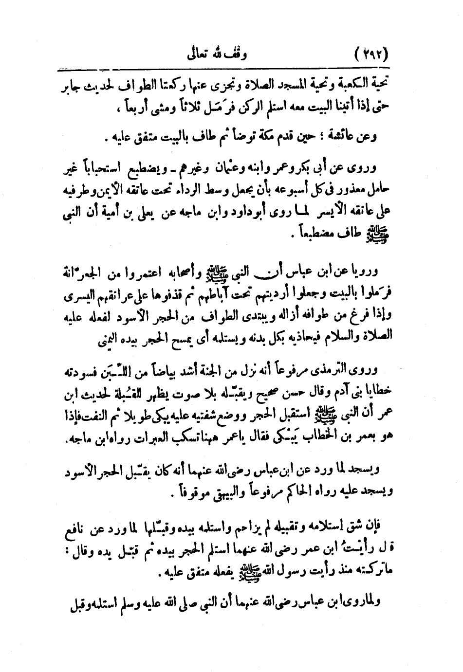 ورويا عن ابن عباس أن النبي - صلى الله عليه وسلم - وأصحابه اعتمروا من الجعرّانة، فرَملوا بالبيت وجعلوا أرديتهم تحت آباطهم، ثم قذفوها على عراتقهم اليسرى، وإذا فرغ من طوافه أزاله ويبتدي الطواف من الحجر الأسود، لفعله –عليه الصلاة والسلام- فيحاذيه بكل بدنه ويستلمه أي يمسح الحجر بيده اليمنى.
