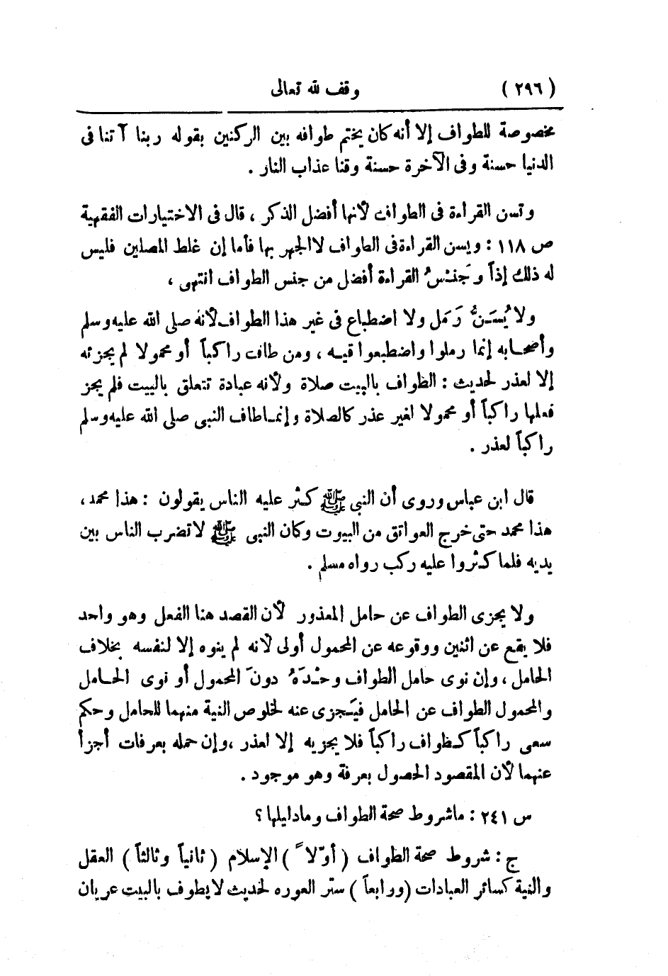 ج: شروط صحة الطواف: أولاً: الإسلام. ثانيًا، وثالثًا: العقل والنية كسائر العبادات. ورابعًا: ستر العورة؛ لحديث: «لا يطوف بالبيت عريان»