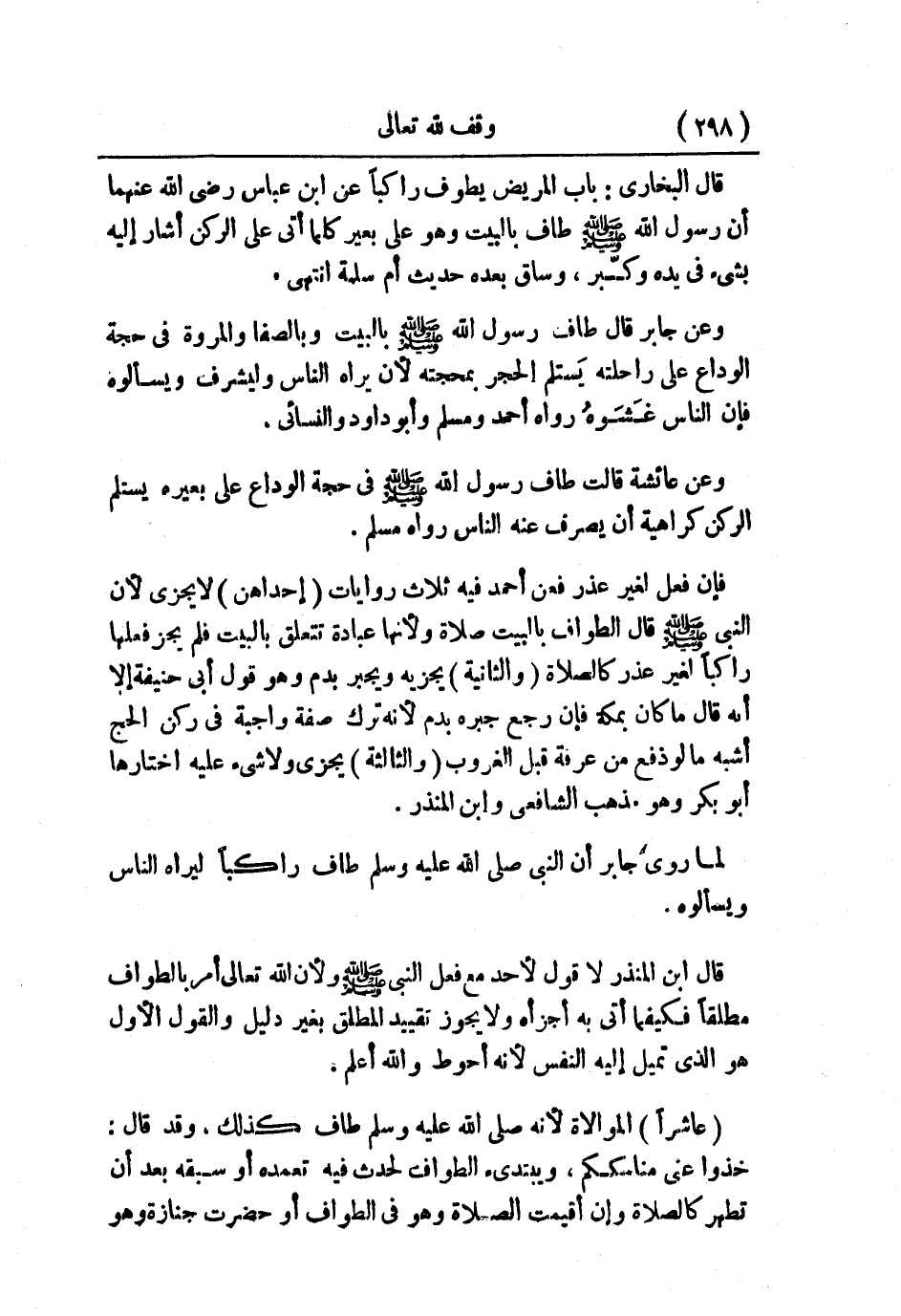 قال البخاري (باب المريض يطوف راكبًا) : عن ابن عباس - رضي الله عنهما - أن رسول الله - صلى الله عليه وسلم - طاف بالبيت وهو على بعير، كلما أتى على الركن أشار إليه بشيء في يده وكبر، وساق بعده حديث أم سلمة. انتهى.
