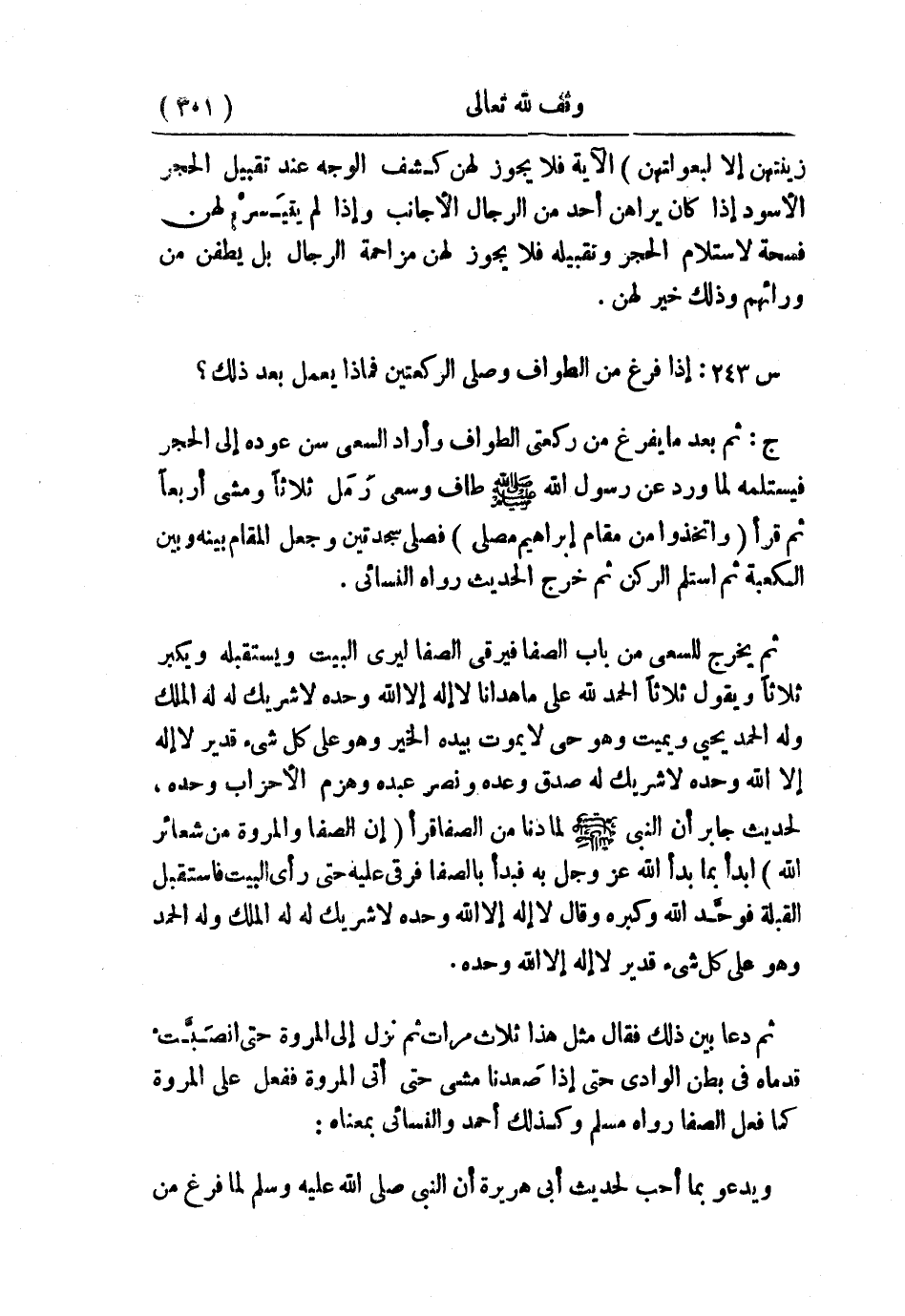ج: ثم بعد ما يفرغ من ركعتي الطواف وأراد السعي سن عوده إلى الحجر فيستلمه؛ لما ورد عن رسول الله - صلى الله عليه وسلم - «طاف وسعَى رَمَل ثلاثًا ومشى أربعًا ثم قرأ: {وَاتَّخِذُوا مِن مَّقَامِ إِبْرَاهِيمَ مُصَلًّى} فصلى سجدتين وجعل المقام بينه وبين الكعبة ثم استلم الركن، ثم خرج» الحديث رواه النسائي.