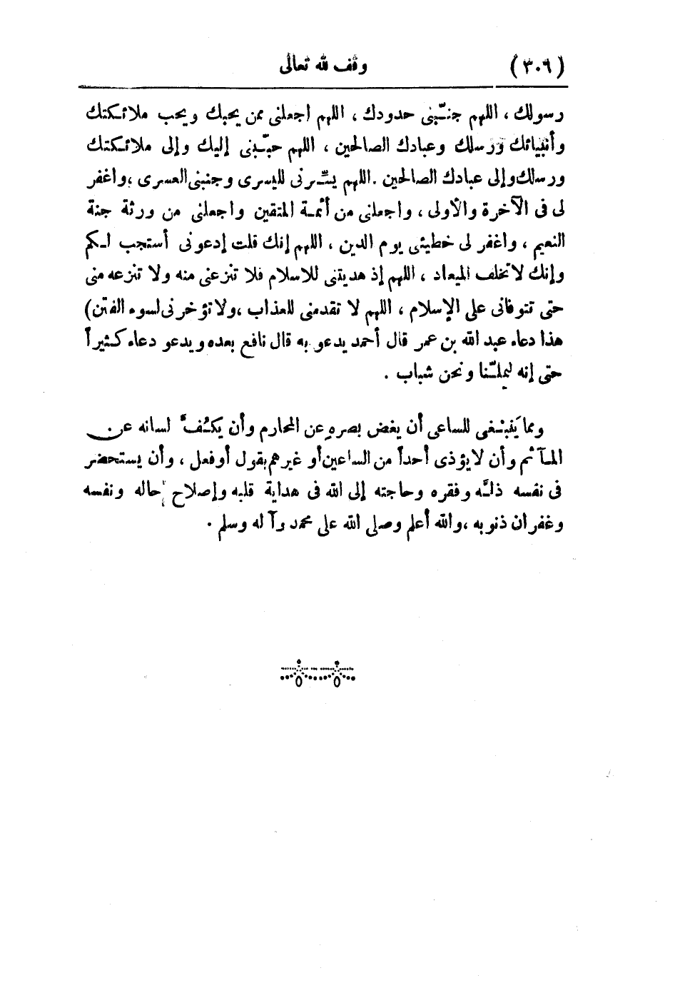 رسولك، اللهم جنبني حدودك، اللهم اجعلني ممن يحبك ويحب ملائكتك وأنبيائك ورسلك وعبادك الصالحين، اللهم حببني إليك وإلى ملائكتك ورسلك وإلى عبادك الصالحين، اللهم يسِّرني لليسرى وجنبني للعسرى، واغفر لي في الآخر والأولى، واجعلني من أئمة المتقين واجعلني من ورثة جنة النعيم، واغفر لي خطيئتي يوم الدين، اللهم إنك قلت إدعوني أستجب لكم وإنك لا تخلف الميعاد، اللهم إذ هديتني للإسلام فلا تنزعني منه، ولا تنزعه مني حتى تتوفاني على الإسلام، اللهم لا تقدمني للعذاب، ولا تؤخرني لسوء الفتن» هذا دعاء عبد الله بن عمر، قال أحمد: يدعو به، قال نافع بعده: ويدعو دعاءً كثيرًا حتى إنه ليملّنا ونحن شباب.