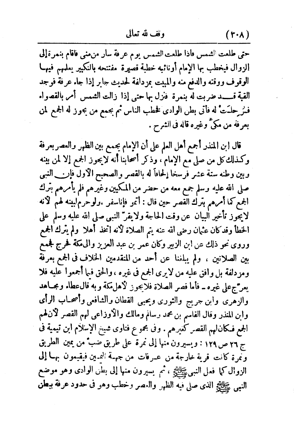 قال ابن المنذر: أجمع أهل العلم على أن الإمام يجمع بين الظهر والعصر بعرفة وكذلك كل من صلى مع الإمام، وذكر أصحابنا أنه لا يجوز الجمع إلا لمن بينه وبين وطنه ستة عشر فرسخًا إلحاقًا له بالقصر والصحيح الأول؛ فإن النبي - صلى الله عليه وسلم - جمع معه من حضر من المكيين وغيرهم فلم يأمرهم بترك الجمع كما أمرهم بترك القصر حين قال: «أتموا، فإنا سفر» ولو حرم لبينه لهم؛ لأنه لا يجوز تأخير البيان عن وقت الحاجة ولا يقرّ النبي - صلى الله عليه وسلم - على الخطأ، وقد كان عثمان - رضي الله عنه - يتم الصلاة؛ لأنه اتخذ أهلاً ولم يترك الجمع، وروى نحو ذلك عن ابن الزبير وكان عمر بن عبد العزيز والي مكة، فخرج فجمع بين الصلاتين، ولم يبلغنا عن أحد من المتقدمين الخلاف في الجمع بعرفة ومزدلفة، بل وافق عليه من لا يرى الجمع في غيره، والحق فيما أجمعوا عليه فلا يعرِّج على غيره؛ فأما قصر الصلاة فلا يجوز لأهل مكة، وبه قال عطاء ومجاهد والزهري وابن جريج والثوري ويحيى القطان والشافعي وأصحاب الرأي وابن المنذر، وقال القاسم بن محمد سالم، ومالك والأوزاعي لهم القصر؛ لأن لم الجمع فكان لهم القصر كغيرهم، وفي «مجموع فتاوى شيخ الإسلام ابن تيمية» في (26/129) : ويسيرون منها إلى نمرة على طريق ضب من يمين الطريق ونمرة كانت قرية خارجة من عرفات من جهة اليمين فيقيمون بها إلى الزوال، كما فعل النبي - صلى الله عليه وسلم -، ثم يسيرون منها إلى بطن الوادي وهو موضع النبي - صلى الله عليه وسلم - الذي صلى فيه الظهر والعصر وخطب وهو في حدود عرفة ببطن