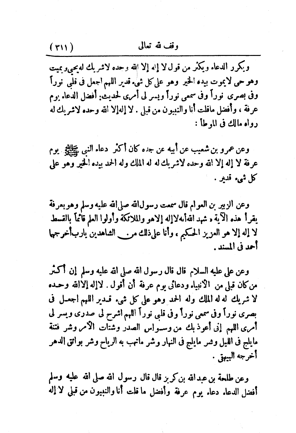 وعن طلحة بن عبد الله بن كريز قال: قال رسول الله صلى الله عليه وسلم: «أفضل الدعاء دعاء يوم عرفة، وأفضل ما قلت أنا والنبيون من قبلي: لا إله