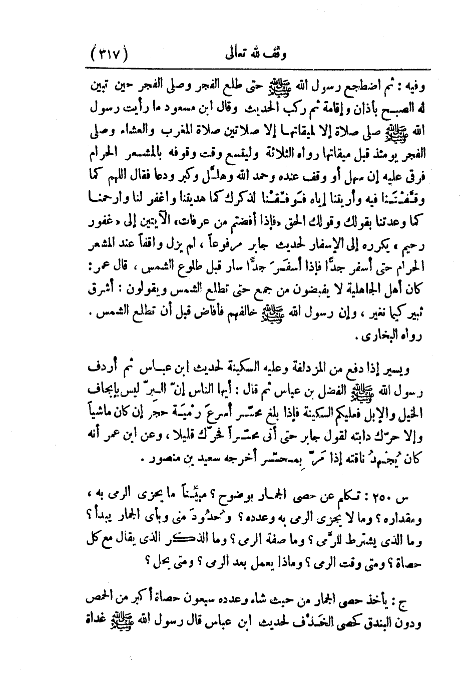 وفيه: «ثم اضطجع رسول الله - صلى الله عليه وسلم - حتى طلع الفجر، وصلى الفجر حين تبين له الصبح بأذان وإقامة، ثم ركب» الحديث. وقال ابن مسعود: «ما رأيت رسول الله - صلى الله عليه وسلم - صلى صلاة إلا لميقاتها، إلا صلاتين صلاة المغرب والعشاء، وصلى الفجر يومئذ قبل ميقاتها» رواه الثلاثة. وليتسع وقت وقوفه بالمشعر الحرام فرقي عليه إن سهل أو وقف عنده وحمد الله وهلَّل وكبر ودعا، فقال: اللهم كما وقَّفْتَنا فيه وأريتنا إياه، فَوفَّقْنا لذكرك، كما هديتنا واغفر لنا وارحمنا، كما وعدتنا بقولك وقولك الحق: {فَإِذَا أَفَضْتُمْ مِّنْ عَرَفَاتٍ} الآيتين إلى {غَفُورٌ رَّحِيمٌ} يكرره إلى الإسفار؛ لحديث جابر مرفوعًا: «لم يزل واقفًا عن المشعر الحرام حتى أسفر جدًّا، فإذا أسفَرَ جدًّا سار قبل طلوع الشمس» ، قال عمر: كان أهل الجاهلية لا يفيضون من جمع حتى تطلع الشمس، ويقولون: أشرق ثبير كيما نغير، وإن رسول الله - صلى الله عليه وسلم - خالفهم، فأفاض قبل أن تطلع الشمس. رواه البخاري.