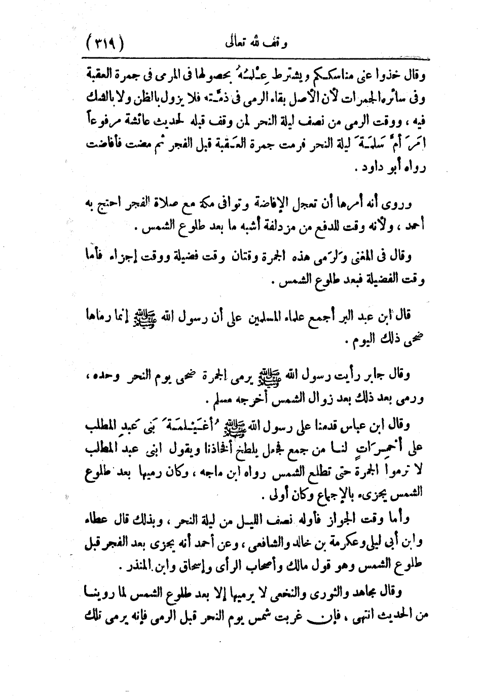 وقال ابن عباس: قدمنا على رسول الله - صلى الله عليه وسلم - أُغَيْلمَةَ بني عبد المطلب على أحْمِرَاتٍ لنا من جمع، فجعل يلطخ أفخاذنا، ويقول: «يا بني عبد المطلب، لا ترموا الجمرة حتى تطلع الشمس» رواه ابن ماجه، وكان رميها بعد طلوع الشمس يجزئ بالإجماع وكان أولى.