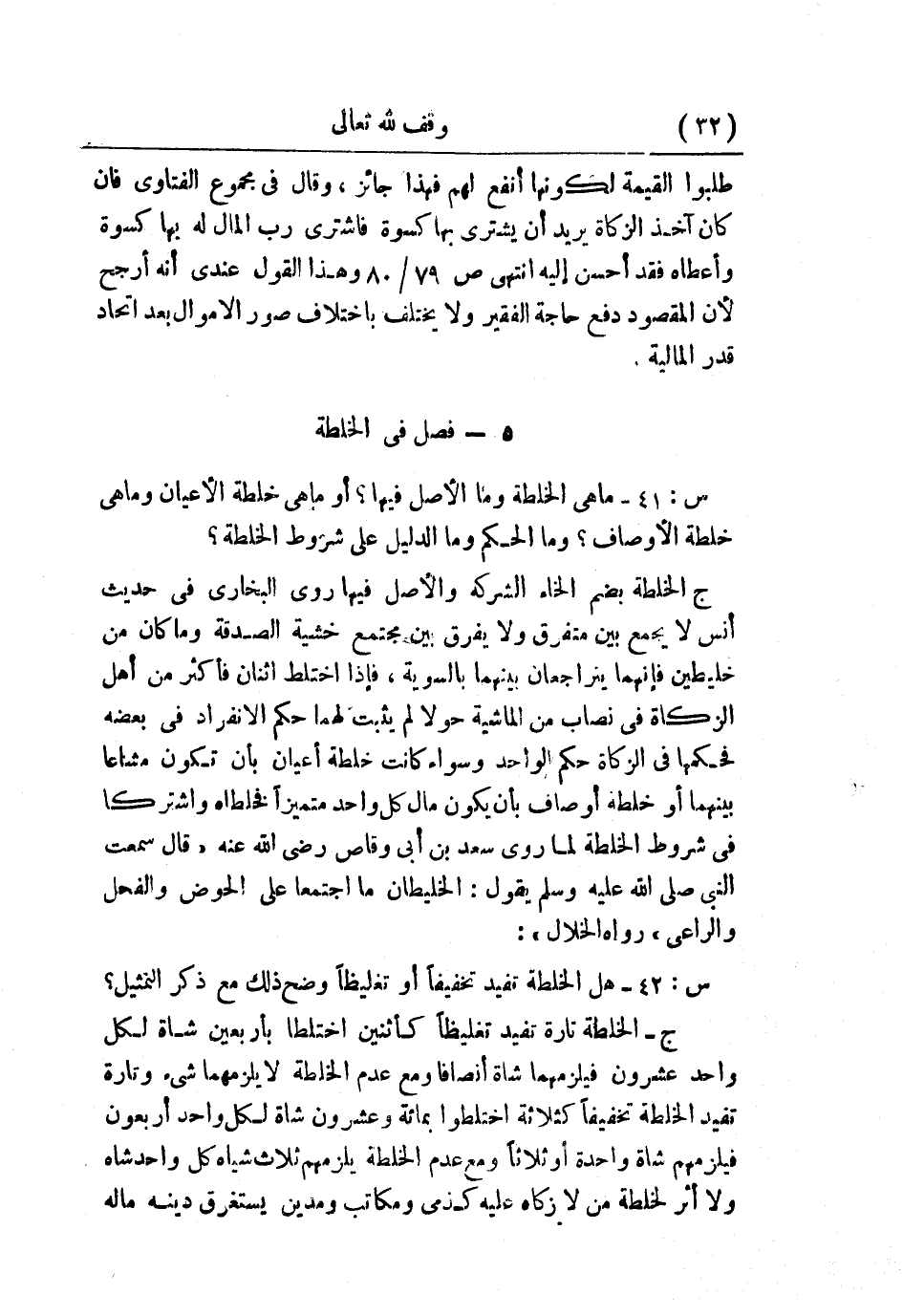 ج: الخلطة: بضم الخاء الشركة، والأصل فيها روى البخاري في حديث أنس لا يجمع بين متفرق ولا يفرق بين مجتمع خشية الصدقة، وما كان من خليطين فإنهما يتراجعان بينهما بالسوية، فإذا اختلط اثنان فأكثر من أهل الزكاة في نصاب من الماشية حولاً لم يثبت لهما حكم الانفراد في بعضها فحكمها في الزكاة حكم الواحد وسواء كانت خلطة أعيان بأن تكون مثلها فحكمها في الزكاة حكم واحد وسواء كانت خلطة أعيان بأن تكون مشاعًا بينهما، أو خلطة أوصاف: بأن يكون مال كل واحد متميزًا فخلطاه واشتركا في شروط الخلطة؛ لما روى سعد بن أبي وقاص - رضي الله عنه -، قال: سمعت رسول الله - صلى الله عليه وسلم - يقول: «الخليطان ما اجتمعا على الحوض والفحل والراعي» رواه الخلال.