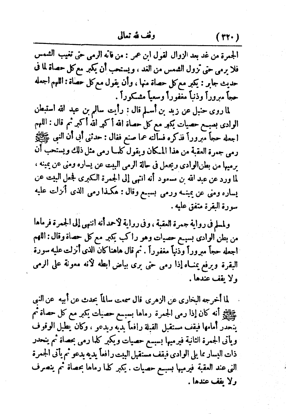 ولمسلم في رواية جمرة العقبة، وفي رواية لأحمد: أنه انتهى إلى الجمرة فرماها من بطن الوادي بسبع حصيات وهو راكب يكبر مع كل حصاة، وقال: «اللهم اجعله حجًا مبرورًا وذنبًا مغفورًا» ، ثم قال: «هاهنا كان الذي أُنزلت عليه سورة البقرة» ويرفع يمناه إذا رمى حتى يرى بياض إبطه؛ لأنه معونة على الرمي ولا يقف عندها.