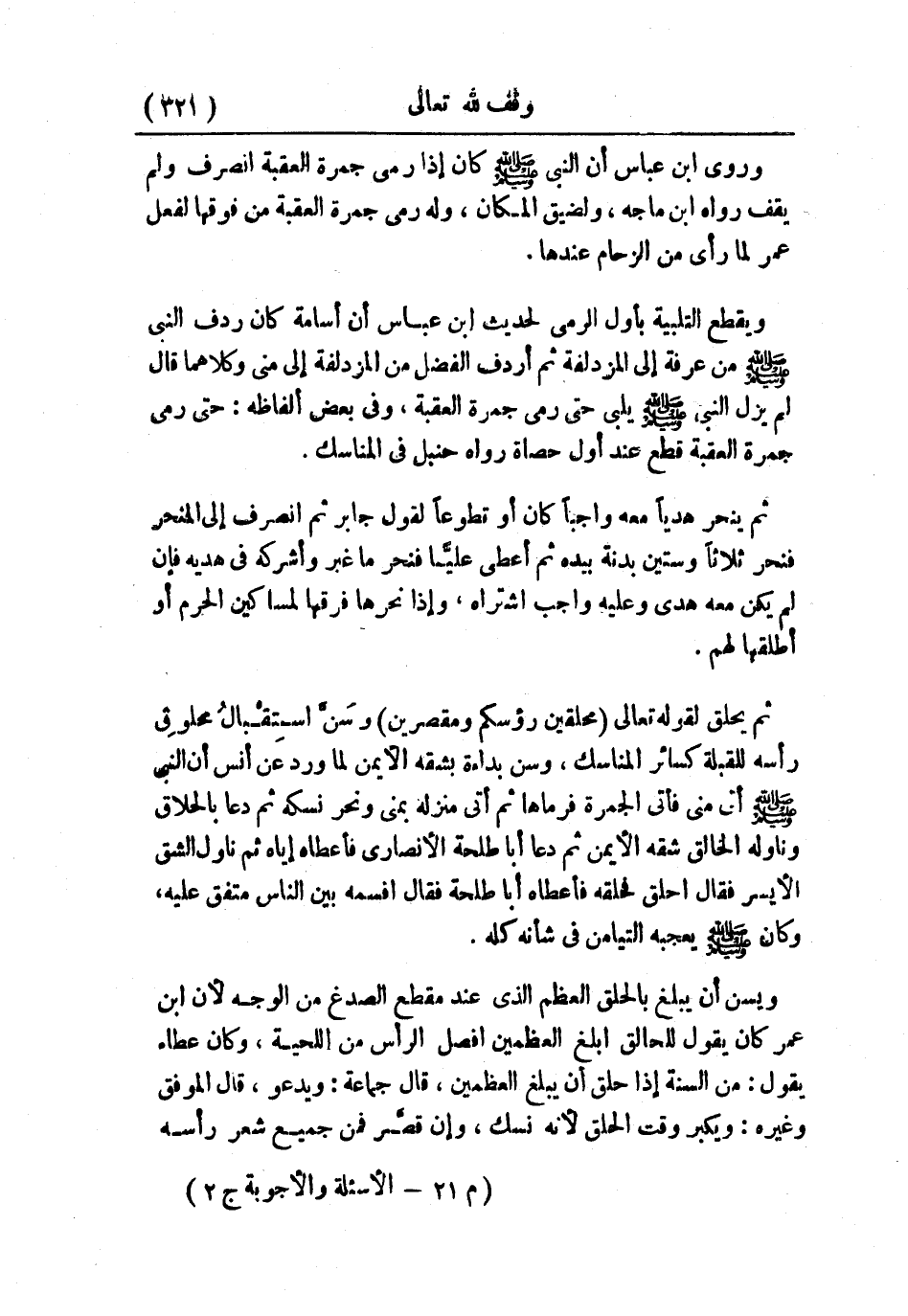 ثم يحلق؛ لقوله تعالى: {مُحَلِّقِينَ رُءُوسَكُمْ وَمُقَصِّرِينَ} وسّنَّ اسِتقبالُ محلوِق رأسه للقبلة كسائر المناسك، وسن بداءة بشقه الأيمن؛ لما ورد عن أنس أن النبي - صلى الله عليه وسلم - أتى منى فأتى الجمرة فرماها، ثم أتى منزله بمنى ونحر نسكه، ثم دعا بالحلاق وناوله الخالق شقه الأيمن، ثم دعا أبا طلحة الأنصاري فأعطاه إياه، ثم ناول الشق الأيسر، فقال: «احلق» ، فحلقه، فأعطاه أبا طلحة، فقال: «اقسمه بين الناس» . متفق عليه. وكان - صلى الله عليه وسلم - يعجبه التيامن في شأنه كله.
