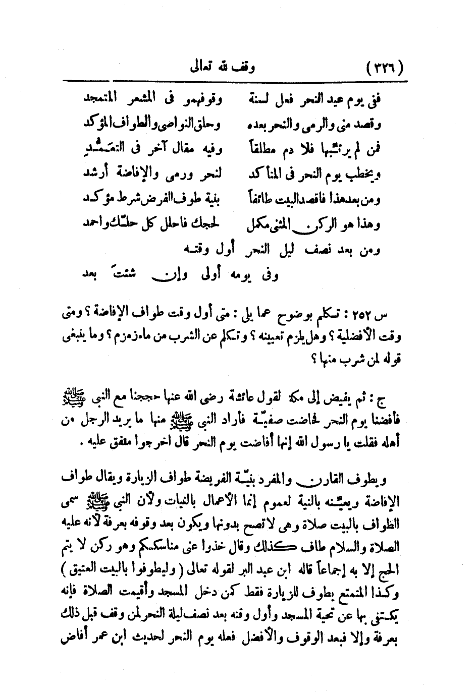 وكذا المتمتع يطوف للزيارة فقط، كمن دخل المسجد وأقيمت الصلاة؛ فإنه يكتفي بها عن تحية المسجد وأول وقته بعد نصف ليلة النحر، لمن وقف قبل ذلك بعرفة وإلا فبعد الوقوف، والأفضل فعله يوم النحر؛ لحديث ابن عمر: «أفاض رسول الله - صلى الله عليه وسلم - يوم النحر» متفق عليه. (وتقدم الكلام على أول وقت الرمي في جواب سؤال 250) .