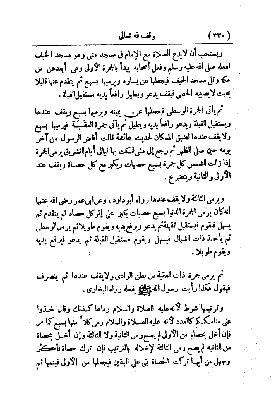 وعن ابن عمر - رضي الله عنهما - «أنه كان يرمي الجمرة الدنيا بسبع حصيات يكبر على إثر كل حصاه ثم يتقدم، ثم يسهل، فيقوم فيستقبل القبلة، ثم يدعو ويرفع يديه ويقوم طويلاً، ثم يرمي الوسطى، ثم يأخذ ذات الشمال فيسهل ويقوم مستقبل القبلة، ثم يدعو فيرفع يديه ويقوم طويلاً، ثم يرمي جمرة ذات العقبة من بطن الوادي، ولا يقف عندها ثم ينصرف» ، فيقول: هكذا رأيت رسول الله - صلى الله عليه وسلم - يفعله. رواه البخاري.