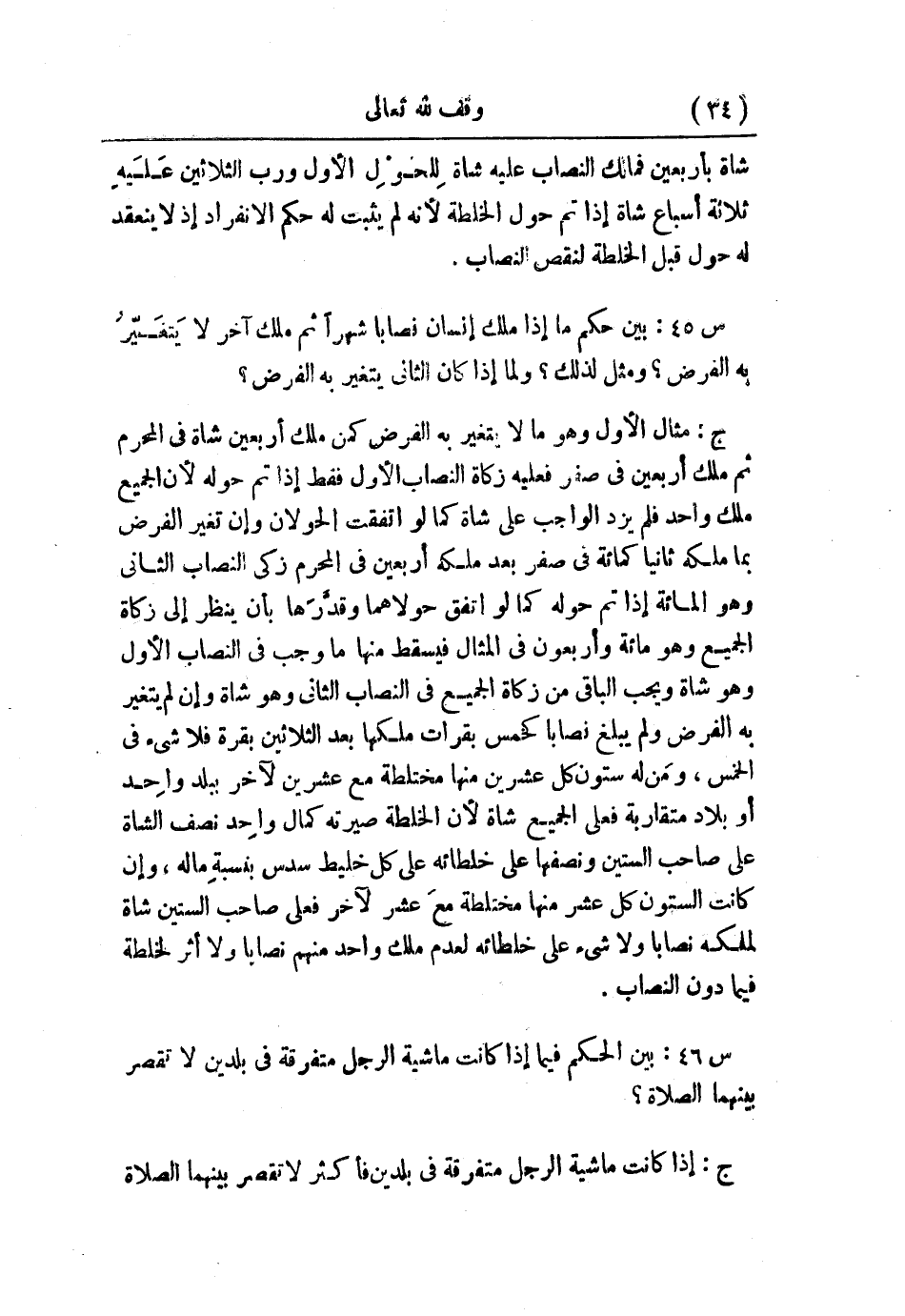 ج: مثال الأول وهو ما لا يتغير به الفرض كمن ملك أربعين شاة في المحرم ثم ملك أربعين في صفر فعليه زكاة النصاب الأول فقط إذا تم حوله؛ لأن الجميع ملك واحد فلم يزد الواجب على شاة كما لو اتفقت الحولان وإن تغير الفرض بما ملكه ثانيًا إذا تم حوله كما لو اتفق حولاهما وقدرها بأن ينظر إلى زكاة الجميع وهو مائة وأربعون في المثال فيسقط منها ما وجب في النصاب الأول وهو شاة ويجب الباقي من زكاة الجميع في النصاب الثاني وهو شاة وإن لم يتغير به الفرض ولم يبلغ نصابًا كخمس بقرات ملكها بعد الثلاثين بقرة فلا شيء في الخمس، ومن له ستون كل عشرين منها مختلطة مع عشرين لآخر ببلد واحد أو بلاد متقاربة فعلى الجميع شاة؛ لأن الخلطة صيرته كمال واحد نصف الشاة على صاحب الستين ونصفها على خلطاته على كل خليط سدس بنسبة ماله، وإن كانت الستون كل عشر منها مختلطة مع عشر لآخر فعلى صاحب الستين شاة لملكه نصابًا ولا شيء على خلطاته لعدم ملك واحد منهم نصابًا ولا أثر لخلطة فيما دون النصاب.