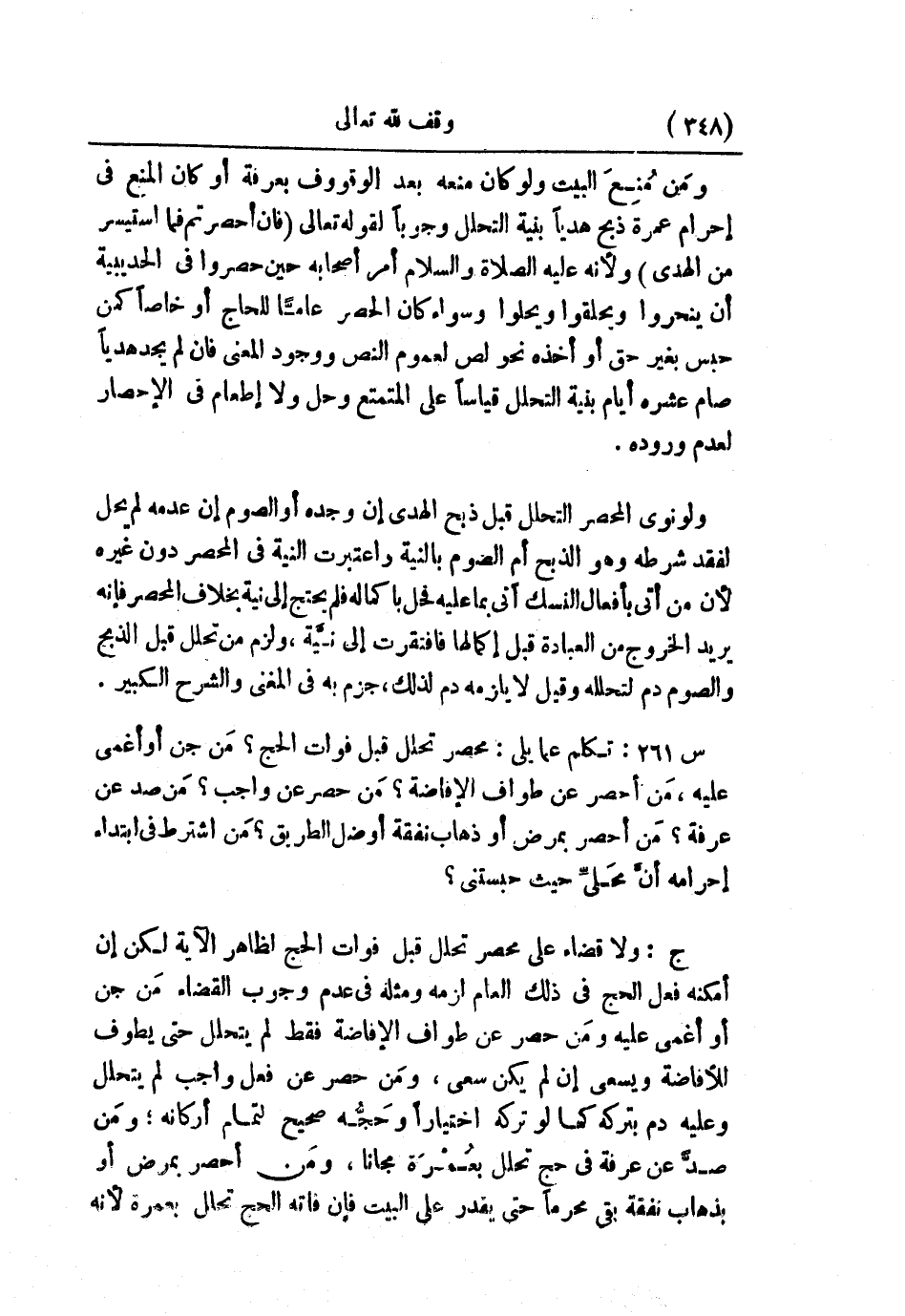 س263: تكلم عما يلي: محصر تحلل قبل فوات الحج؟ مَن جن أو أغمي عليه، مَن أحصر عن طواف الإفاضة؟ مَن حصر عن واجب؟ مَن صد عن عرفة؟ مَن أحصر بمرض أو ذهاب نفقة أو ضل الطريق؟ مَن اشترط في ابتداء إحرامه أنَّ محَليِّ حيث حبستني؟