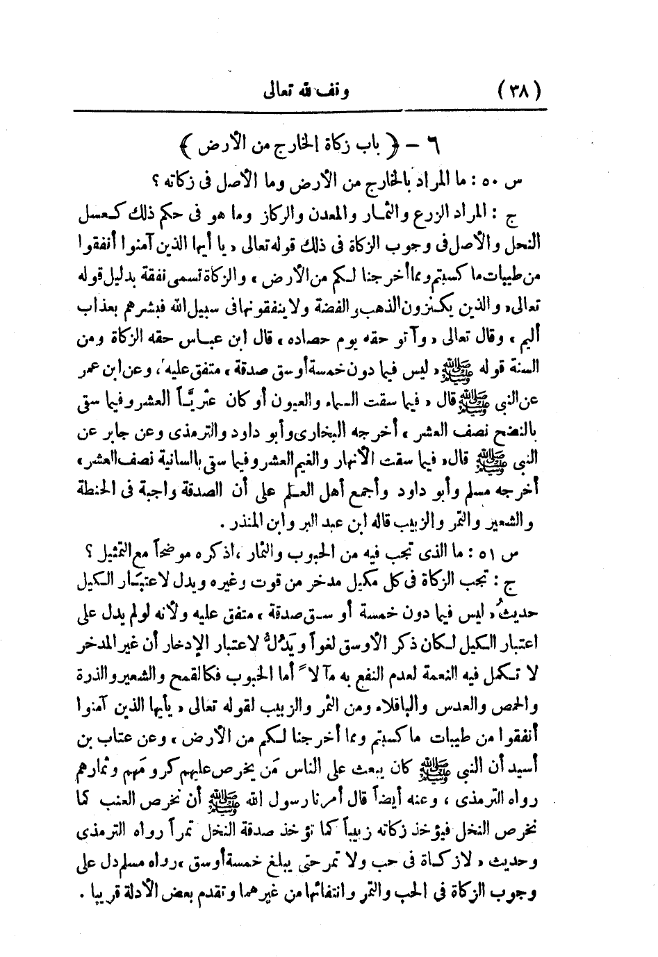 ج: المراد الزرع والثمار والمعدن والركاز وما هو في حكم ذلك كعسل النحل، والأصل في وجوب الزكاة في ذلك قوله تعالى: {يَا أَيُّهَا الَّذِينَ آمَنُوا أَنفِقُوا مِن طَيِّبَاتِ مَا كَسَبْتُمْ وَمِمَّا أَخْرَجْنَا لَكُم مِّنَ الأَرْضِ} ، والزكاة تسمى نفقة بدليل قوله تعالى: {وَالَّذِينَ يَكْنِزُونَ الذَّهَبَ وَالْفِضَّةَ وَلاَ يُنفِقُونَهَا فِي سَبِيلِ اللَّهِ فَبَشِّرْهُم بِعَذَابٍ أَلِيمٍ} ، وقال تعالى: {وَآتُوا حَقَّهُ يَوْمَ حَصَادِهِ} قال ابن عباس: حقه الزكاة، ومن السُّنة قوله - صلى الله عليه وسلم -: «ليس فيما دون خمسة أوسق صدقة» متفق عليه، وعن ابن عمر عن النبي - صلى الله عليه وسلم - قال: «فيما سقت السماء والعيون أو كان عتريًّا العشر، وفيما سقى بالنضح نصف العشر» أخرجه البخاري وأبو داود والترمذي، وعن جابر عن النبي - صلى الله عليه وسلم - قال: «فيما سقت الأنهار والغيم العشر، وفيما سقى بالسانية نصف العشر» أخرجه مسلم وأبو داود، وأجمع أهل العلم عن أن الصدقة واجبة في الحنطة والشعير والتمر والزبيب، قاله ابن عبد البر وابن المنذر.