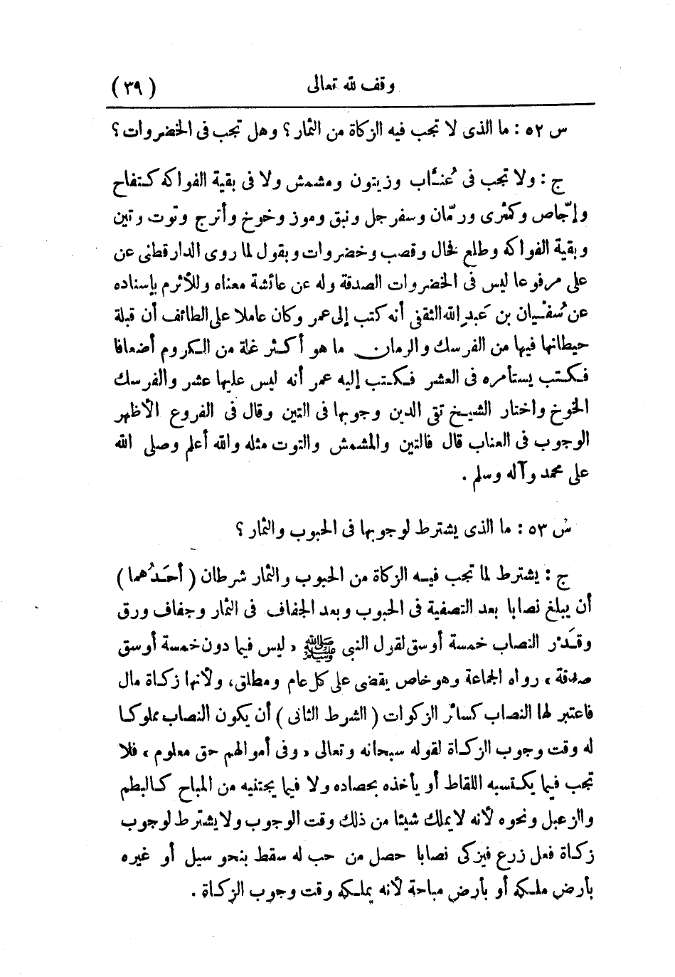 ج: لا تجب في عُناب وزيتون ومشمش ولا في بقية الفواكه كتفاح وإجاص وكمثرى ورمان وسفرجل ونبق وموز وخوخ وأترج وتوت وتين وبقية الفواكه وطلع فحال وقصب وخضروات وبقول؛ لما روى الدارقطني عن علي مرفوعًا: «ليس في الخضروات الصدقة» ، وله عن عائشة معناه، وللأثرم بإسناد عن سفيان بن عبد الله الثقفي أنه كتب إلى عمر وكان عاملاً على الطائف أن قبلة حيطانها فيها من الفرسك والرمان ما هو أكثر غلة من الكروم أضعافًا فكتب يستأمره في العشر فكتب إليه عمر أنه ليس عليها عشر والفرسك الخوخ، واختار الشيخ تقي الدين وجوبها في التين، وقال في الفروع: الأظهر الوجوب في العناب، قال: فالتين والمشمش والتوت مثله. والله أعلم، وصلى الله على محمد وآله وسلم.