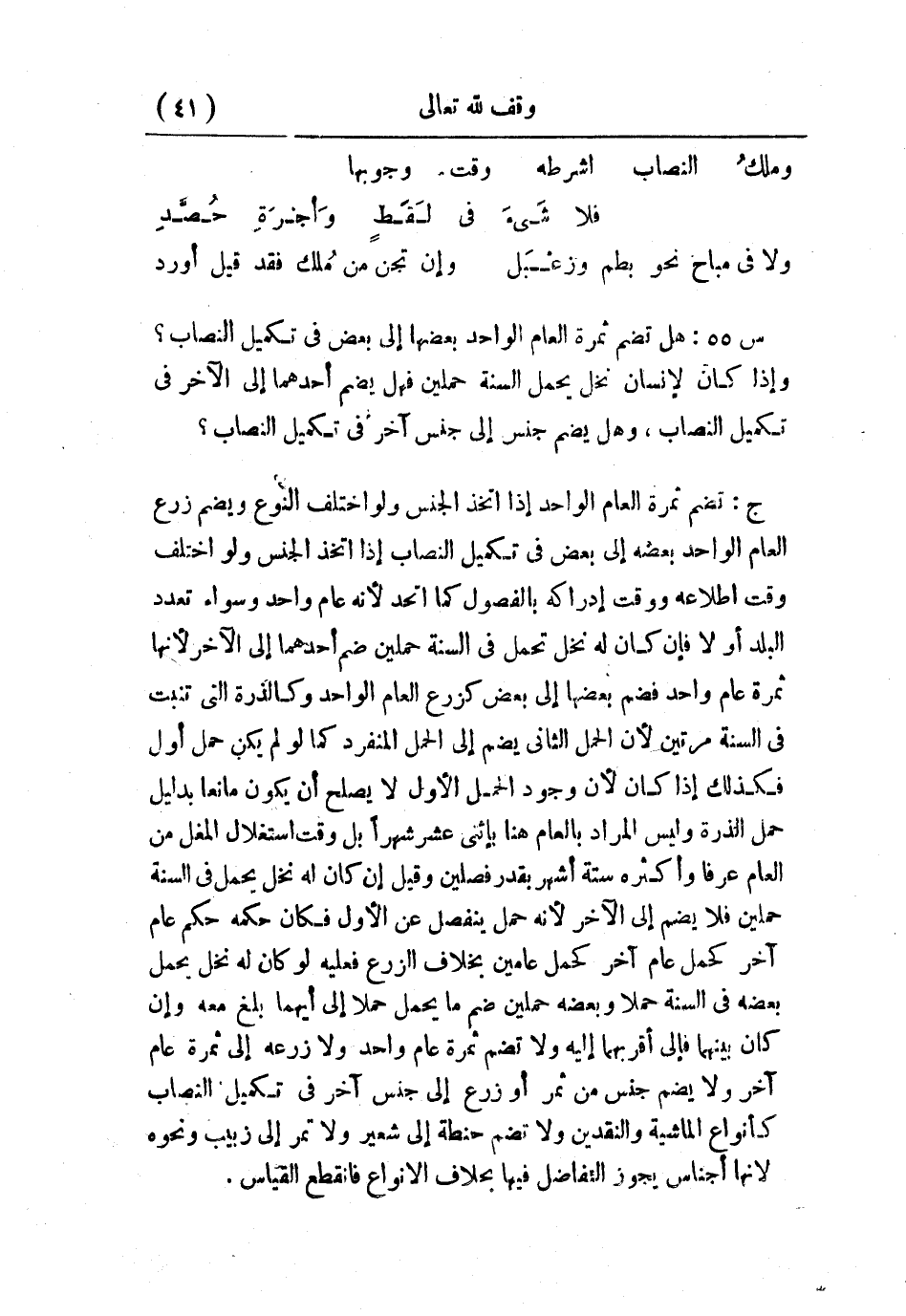 ج: تضم ثمرة العام الواحد إذا اتخذ الجنس ولو اختلف النوع ويضم زرع العام الواحد بعضها إلى بعض في تكميل النصاب إذا اتخذ الجنس، ولو اختلف وقت اطلاعه ووقت إدراكه بالفصول كما اتحد؛ لأنه عام واحد وسواء تعدد البلد أو لا؛ فإن كان له نخل تحمل في السنة حملين ضم أحدهما إلى الآخر؛ لأنها ثمرة عام واحد فضم بعضها إلى بعض كزرع العام الواحد وكالذرة التي تنبت في السنة مرتين؛ لأن الحمل الثاني يضم إلى الحمل المنفرد كما لو لم يكن حمل أول فكذلك إذا كان؛ لأن وجود الحمل الأول لا يصلح أن يكون مانعًا بدليل حمل الذرة وليس المراد بالعام هنا بإثني عشر شهرًا، بل وقت استغلال المغل من العام عرفًا وأكثره ستة أشهر بقدر فصلين، وقل: إن كان له نخل يحمل في السنة حملين فلا يضم إلى الآخر؛ لأنه حمل ينفصل عن الأول فكان حكمه حكم عام آخر كحمل عام آخر كحمل عامين بخلاف الزرع، فعليه لو كان له نخل يحمل بعضه في السنة حملاً وبعضه حملين، ضم ما يحمل حملاً إلى أيهما بلغ معه، وإن كان بينهما فإلى أقربهما إليه ولا تضم ثمرة عام واحد ولا زرعه إلى ثمرة عام آخر، ولا يضم جنس من ثمر أو زرع إلى جنس آخر في تكميل النصاب كأنواع الماشية والنقدين ولا تضم حنطة إلى شعير ولا تمر إلى زبيب ونحوه؛ لأنها أجناس يجوز التفاضل فيها بخلاف الأنواع فانقطع القياس.