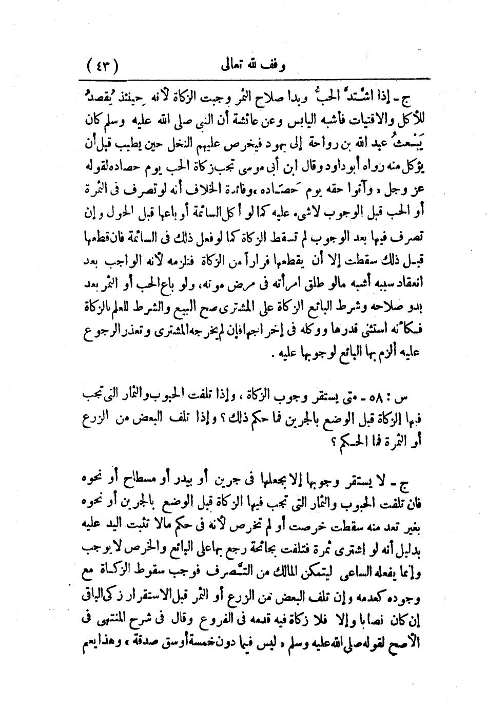 س58: متى يستقر وجوب الزكاة، وإذا تلفت الحبوب والثمار التي تجب فيها الزكاة قبل الوضع بالجرين، فما حكم ذلك؟ وإذا تلف البعض عن الزرع أو الثمر، فما الحكم؟