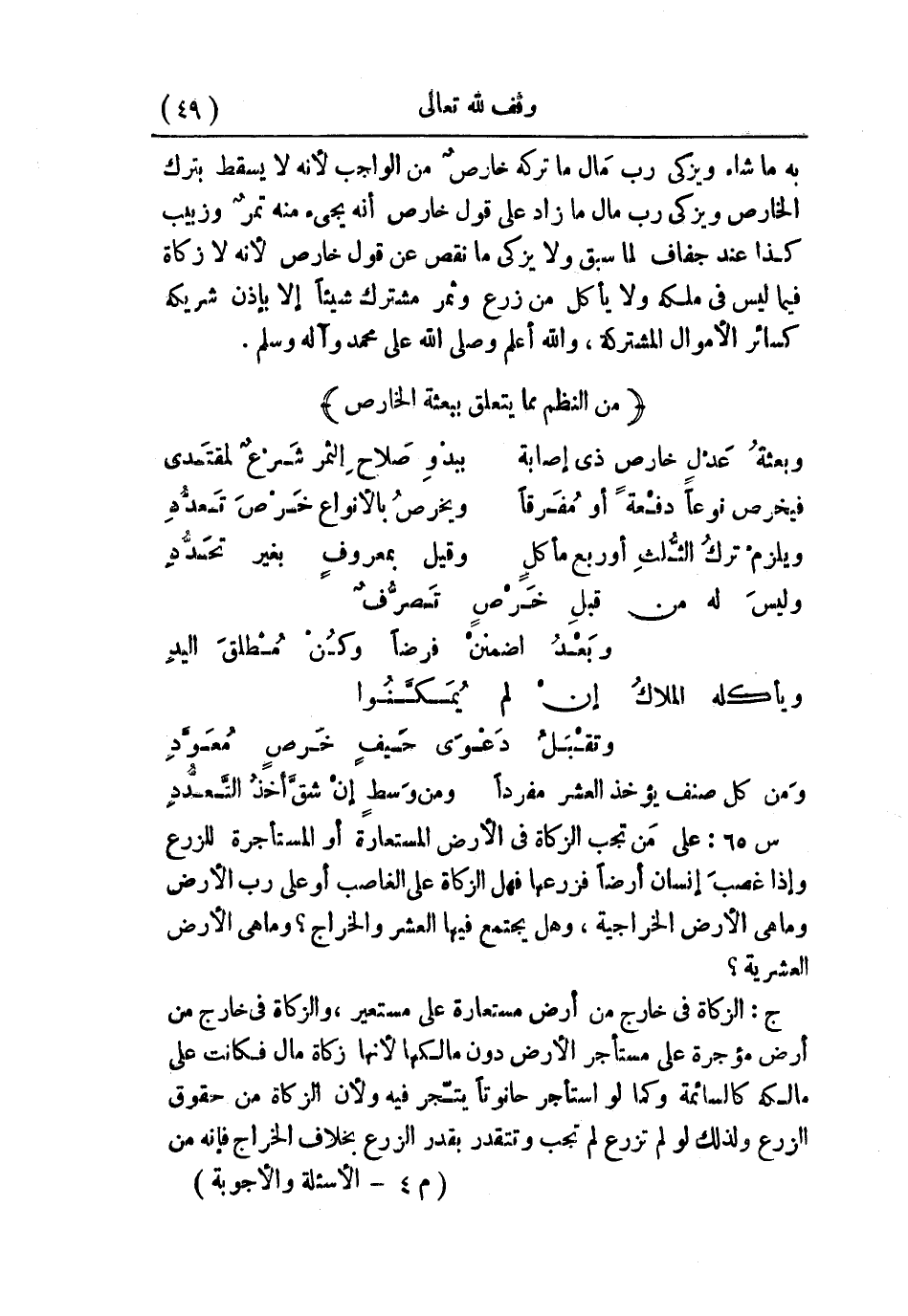 ج: الزكاة في خارج من أرض مستعارة على مستعير، والزكاة في خارج من أرض مؤجرة على مستأجر الأرض دون مالكها؛ لأنها زكاة مال فكانت على مالكه كالسائمة وكما لو استأجر حانوتًا يتّجر فيه؛ ولأن الزكاة من حقوق الزرع، ولذلك لو لم تزرع لم تجب وتتقدر بقدر الزرع بخلاف الخراج فإنه من