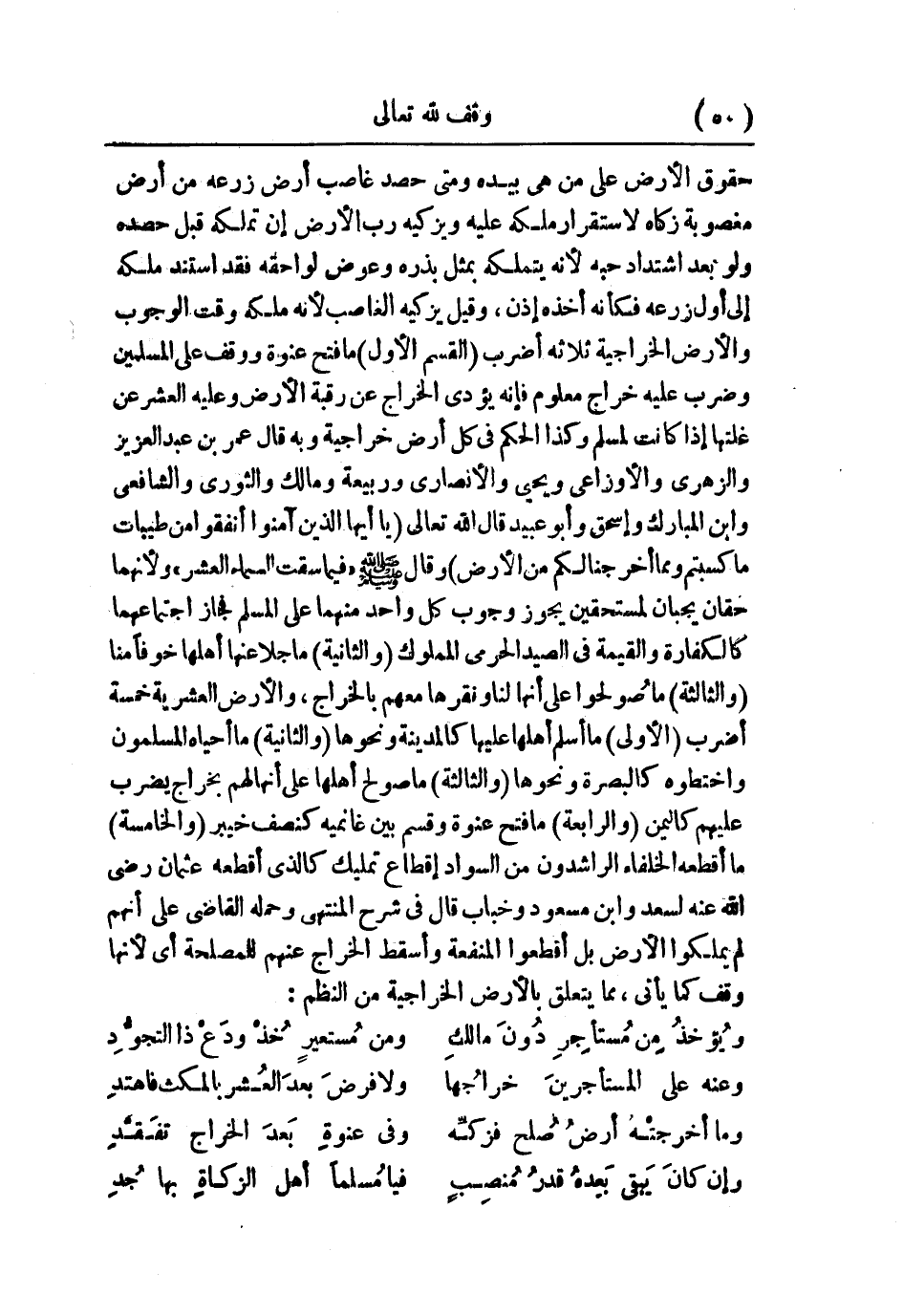 حقوق الأرض على من هي بيده ومتى حصد غاصب أرض زرعه من أرض مغصوبة زكاة لاستقرار ملكه عليه ويزكيه رب الأرض إن تملكه قبل حصده ولو بعد اشتداد حبه؛ لأنه يتملكه بمثل بذره وعوض لواحقه فقد استند ملكه إلى أول زرعه فكأنه أخذه إذن، وقيل: يزكيه الغاصب؛ لأنه ملكه وقت الوجوب والأرض الخراجية ثلاثة أضرب: القسم الأول: ما فتح عنوة ووقف على المسلمين وضرب عليه خراج معلوم؛ فإنه يؤدي الخراج عن رقبة الأرض وعليه العشر عن غلتها إذا كانت لمسلم، وكذا الحكم في كل أرض خراجية، وبه قال عمر بن عبد العزيز والزهري والأوزاعي ويحيى والأنصاري وربيعة ومالك والثوري والشافعي وابن المبارك وإسحاق وأبو عبيد. قال الله تعالى: {يَا أَيُّهَا الَّذِينَ آمَنُوا أَنفِقُوا مِن طَيِّبَاتِ مَا كَسَبْتُمْ وَمِمَّا أَخْرَجْنَا لَكُم مِّنَ الأَرْضِ} ، وقال - صلى الله عليه وسلم -: «فيما سقت السماء العشر» ولأنهما حقان يجبان لمستحقين يجوز وجوب كل واحد منهما على المسلم فجاز اجتماعهما كالكفارة والقيمة في الصيد الحرمي المملوك. والثانية: ما جلا عنها أهلها خوفًا منا. والثالثة: ما صُولحوا على أنها لنا ونقرها معهم بالخراج، والأرض العشرية خمسة أضرب: الأولى: ما أسلم أهلها عليها كالمدينة ونحوها. والثانية: ما أحياه المسلمون واختطوه كالبصرة ونحوها. والثالثة: ما صولح أهلها على أنها لهم بخراج يضرب عليهم كاليمن. والرابعة: ما فتح عنوة وقسم بين غانميه كنصف خيبر. والخامسة: ما أقطعه الخلفاء الراشدون من السواد إقطاع تمليك كالذي أقطعه عثمان - رضي الله عنه - لسعد وابن مسعود وخباب قال في «شرح المنتهى» وحمله القاضي على أنهم لم يملكوا الأرض، بل أقطعوا المنفعة وأسقط الخراج عنهم للمصلحة أي لأنها وقف كما يأتي، مما يتعلق بالأرض الخراجية من النظم: