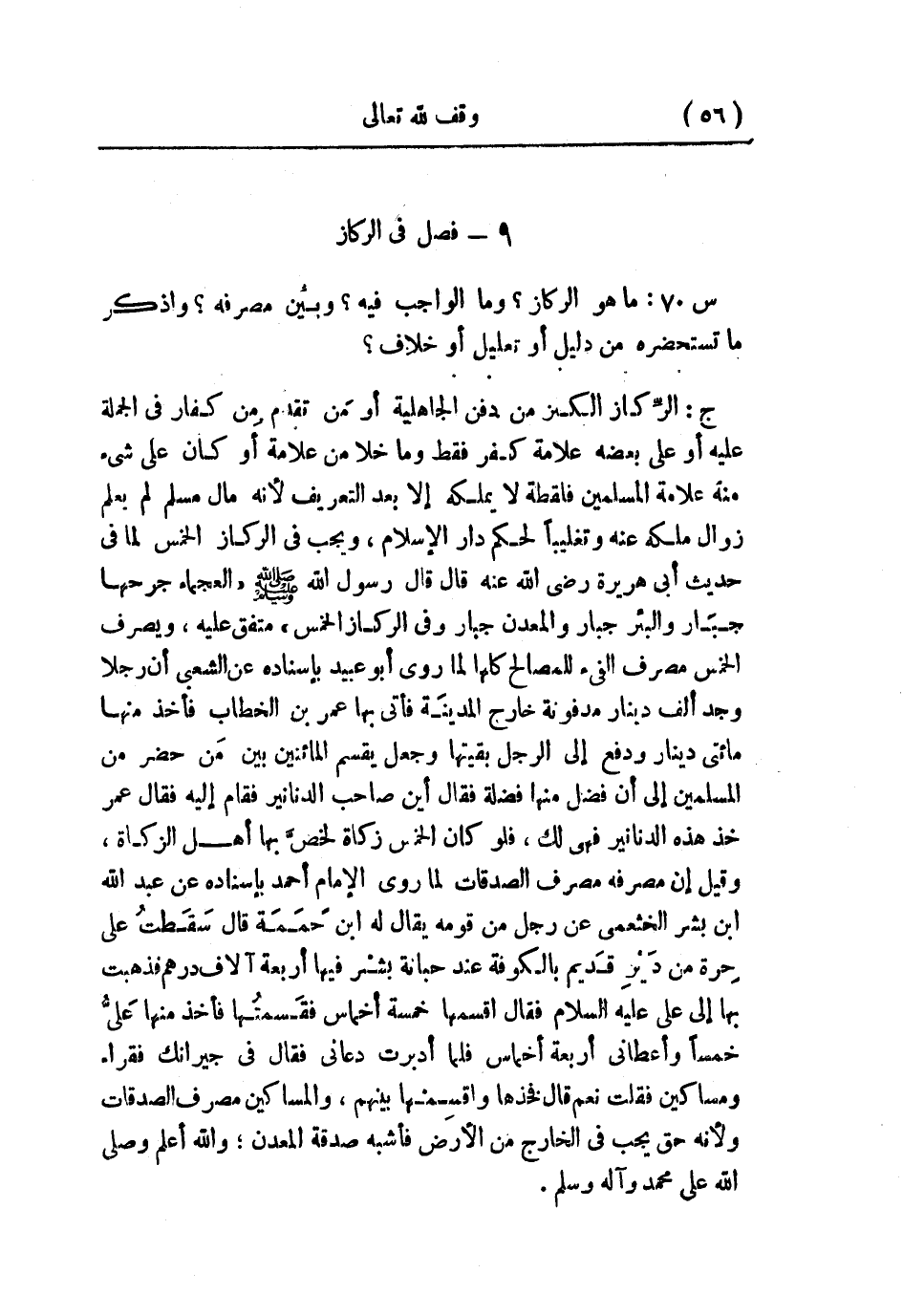 ج: الرِّكاز الكنز من دفن الجاهلية أو مَن تقدم عن كفار في الجملة عليه أو على بعضه علامة كفر فقط، وما خلا من علامة أو كان على شيء منه علامة المسلمين فلقطة لا يملكه إلا بعد التعريف؛ لأنه مال مسلم لم يعلم زوال ملكه عنه وتغليبًا لحكم دار الإسلام، ويجب في الركاز الخمس؛ لما في حديث أبي هريرة - رضي الله عنه - قال: قال رسول الله - صلى الله عليه وسلم -: «العجماء جرحها جبَار والبئر جبار والمعدن جبار، وفي الركاز الخمس» متفق عليه، ويصرف الخمس مصرف الفيء للمصالح كلها؛ لما روى أبو عبيد بإسناده عن الشعبي أن رجلاً وجد ألف دينار مدفونة خارج المدينة، فأتى بها عمر بن الخطاب، فأخذ منها مائتي دينار ودفع إلى الرجل بقيتها، وجعل يقسم المائتين بين من حضر من المسلمين إلى أن فضل منها فضلة، فقال: أين صاحب الدنانير، فقام إليه، فقال عمر: خذ هذه الدنانير فهي لك، فلو كان الخمس زكاة لخصَّ بها أهل الزكاة، وقيل: إن مصرفه مصرف الصدقات؛ لما روى الإمام أحمد بإسناده عن عبد الله ابن بشر الخثعمي عن رجل من قومه، يقال له: ابن حَمَمَة، قال: سقطتُ على حِرة من دَيْر قَديم بالكوفة عند حبانة بشْر فيها أربعة آلاف درهم فذهبت بها إلى علي -عليه السلام-، فقال: اقسمها خمسة أخماس، فقَسمتُها، فأخذ منها عَليُّ خمسًا وأعطاني أربعة أخماس، فلما أدبرت دعاني، فقال: في جيرانك فقراء ومساكين، فقلت: نعم، قال: فخذها واقسمها بينهم، والمساكين مصرف الصدقات؛ ولأنه حق يجب في الخارج من الأرض فأشبه صدقة المعدن. والله أعلم، وصلى الله على محمد وآله وسلم.