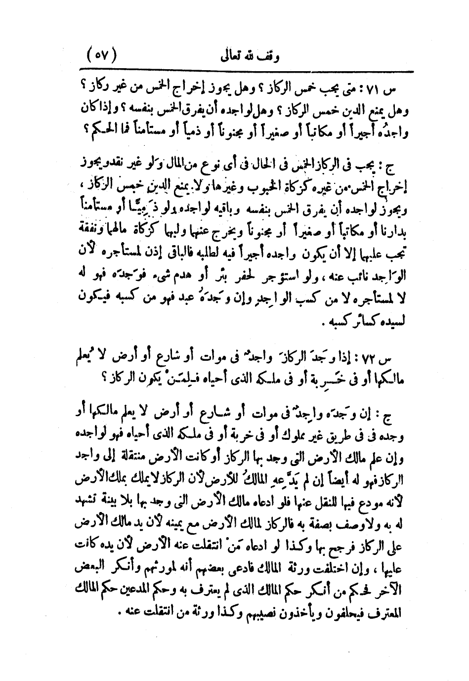 س72: إذا وجَدَ الركازَ واجدٌ في موات أو شارع أو أرض لا يُعلم مالكها أو في خَرِبة أو في ملكه الذي أحياه فلِمَنْ يكون الركاز؟