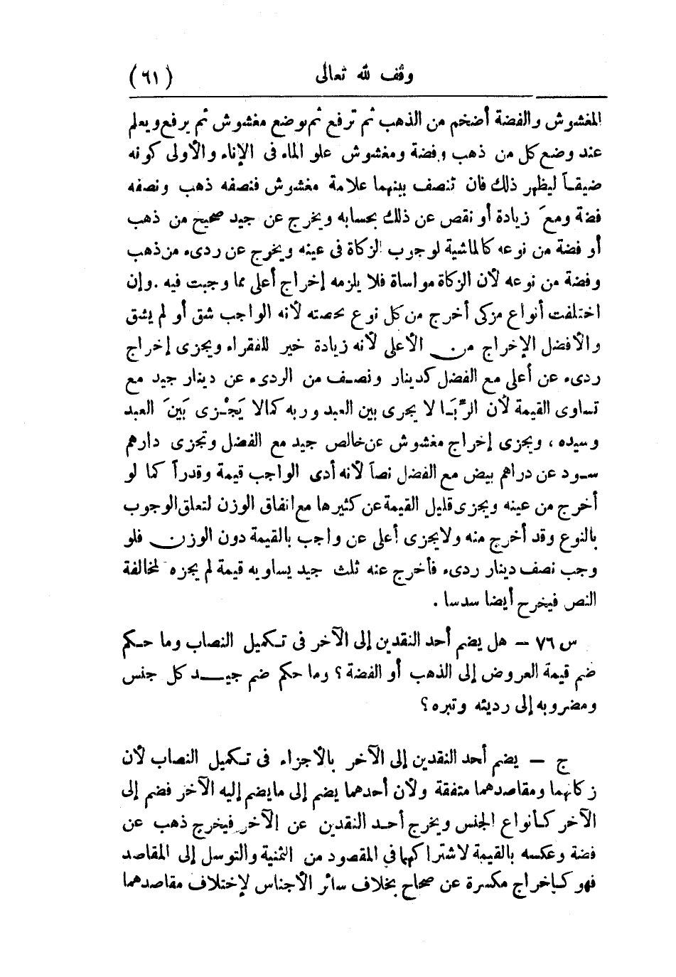 ج: يضم أحد النقدين إلى الآخر بالأجزاء في تكميل النصاب؛ لأن زكاتهما ومقاصدهما متفقة؛ ولأن أحدهما يضم إلى ما يضم إليه الآخر فضم إلى الآخر كأنواع الجنس ويخرج أحد النقدين عن الآخر فيخرج ذهب عن فضة وعكسه بالقيمة لاشتراكهما في المقصود من الثمنية والتوسل إلى المقاصد فهو كإخراج مكسرة عن صحاح بخلاف سائر الأجناس لاختلاف مقاصدهما؛