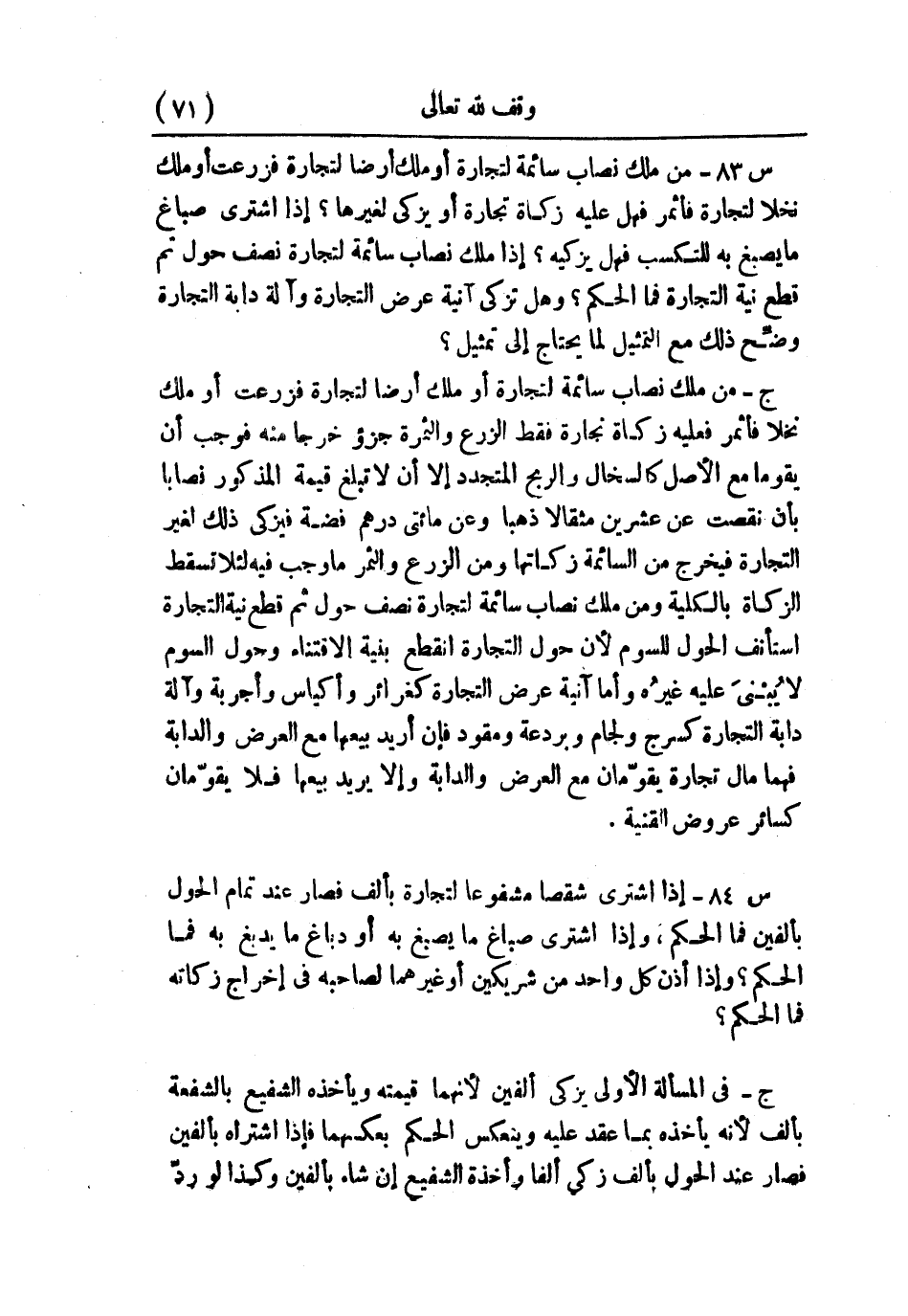 س84: إذا اشترى شقصًا مشفوعًا لتجارة بألف فصار عند تمام الحول بألفين فما الحكم؟ وإذا اشترى صباغ ما يصبغ به أو دباغ ما يدبغ به فما الحكم؟ وإذا أذن كل واحد من شريكين أو غيرهما لصاحبه في إخراج زكاته فما الحكم؟