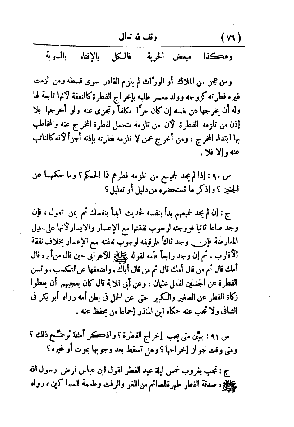 ج: إن لم يجد لجميعهم بدأ بنفسه لحديث: «ابدأ بنفسك ثم بمن تعول» ؛ فإن وجد صاعًا ثانيًا فزوجته لوجوب نفقتها مع الإعسار والإيسار؛ لأنها على سبيل المعارضة؛ فإن وجد ثالثًا فلرقيقه لوجوب نفقته مع الإعسار بخلاف نفقة الأقارب، ثم إن وجد رابعًا فأمه؛ لقوه - صلى الله عليه وسلم - للأعرابي حين قال: من أبر؟ قال: «أمك» قال: ثم من؟ قال: «أمك» ، قال: ثم من؟ قال: «أباك» ولضعفها عن التكسب، وتسن الفطرة عن الجنين لفعل عثمان، وعن أبي قلابة قال: كان يعجبهم أن يعطوا زكاة الفطر عن الصغير والكبير حتى عن الحمل في بطن أمه، رواه أبو بكر في «الشافي» ، ولا تجب عنه حكاه ابن المنذر إجماعًا من يحفظ عنه.