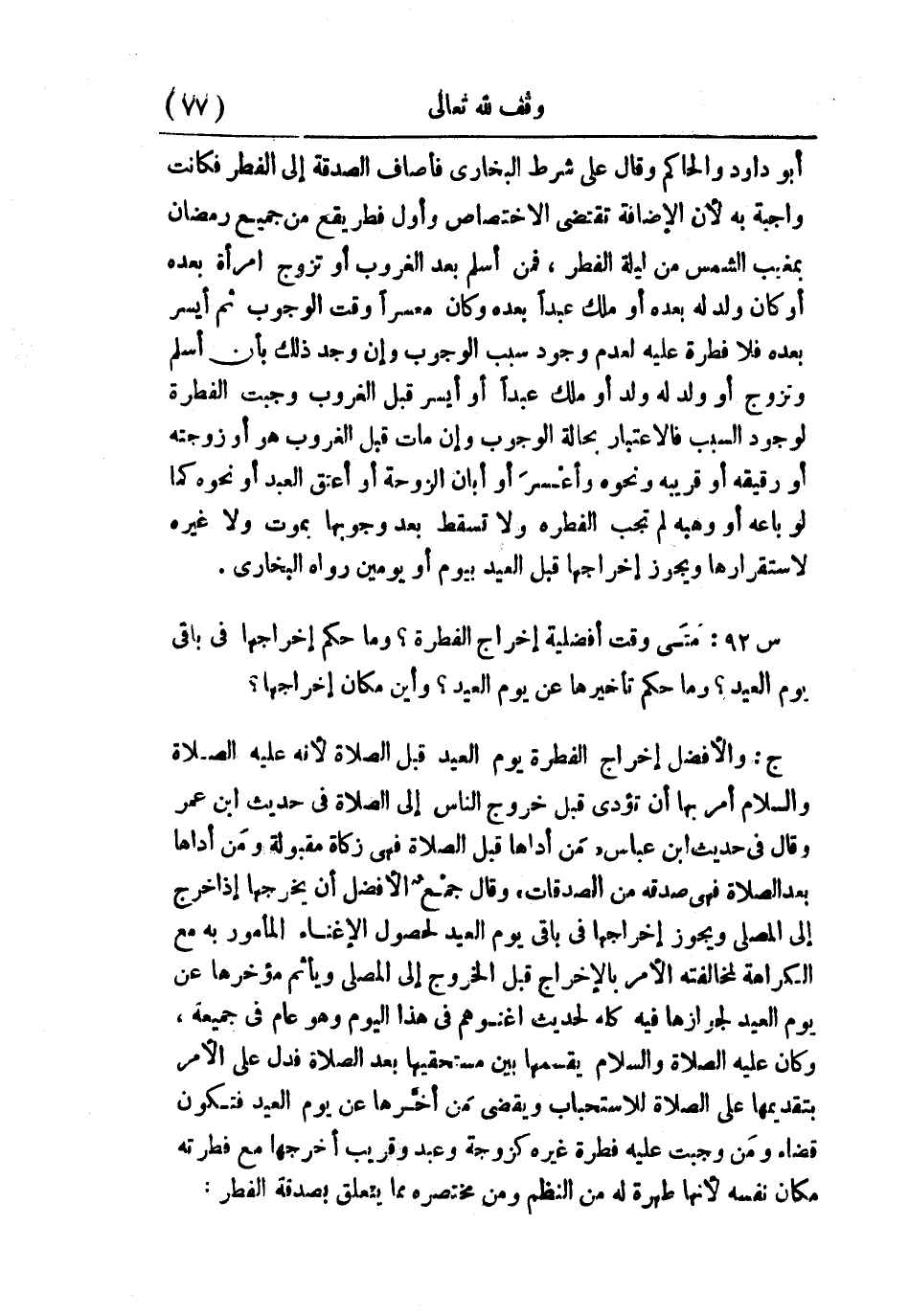 ج: والأفضل إخراج الفطرة يزن العيد قبل الصلاة؛ لأنه –عليه الصلاة والسلام- أمر بها أن تؤدى قبل خروج الناس إلى الصلاة في حديث ابن عمر، وقال في حديث ابن عباس: «من أداها قبل الصلاة فهي زكاة مقبولة، ومن أداها بعد الصلاة فهي صدقة من الصدقات» ، وقال جمع: الأفضل أن يخرجها إذا خرج إلى المصلى ويجوز إخراجها في باقي يوم العيد لحصول الإغناء المأمور به مع الكراهة لمخالفته الأمر بالإخراج قبل الخروج إلى المصلى، ويأثم مؤخرها عن يوم العيد لجوازها فيه كله؛ لحديث: «اغنوهم في هذا اليوم» ، وهو عام في جميعه، وكان –عليه الصلاة والسلام- يقسمها بين مستحقيها بعد الصلاة، فدل على الأمر بتقديمها على الصلاة للاستحباب، ويقضي من أخرها عن يوم العيد فتكون قضاء، ومن وجبت عليه فطرة غيره كزوجة وعبد وقريب أخرجها مع فطرته كان نفسه؛ لأنها طهرة له من النظم.