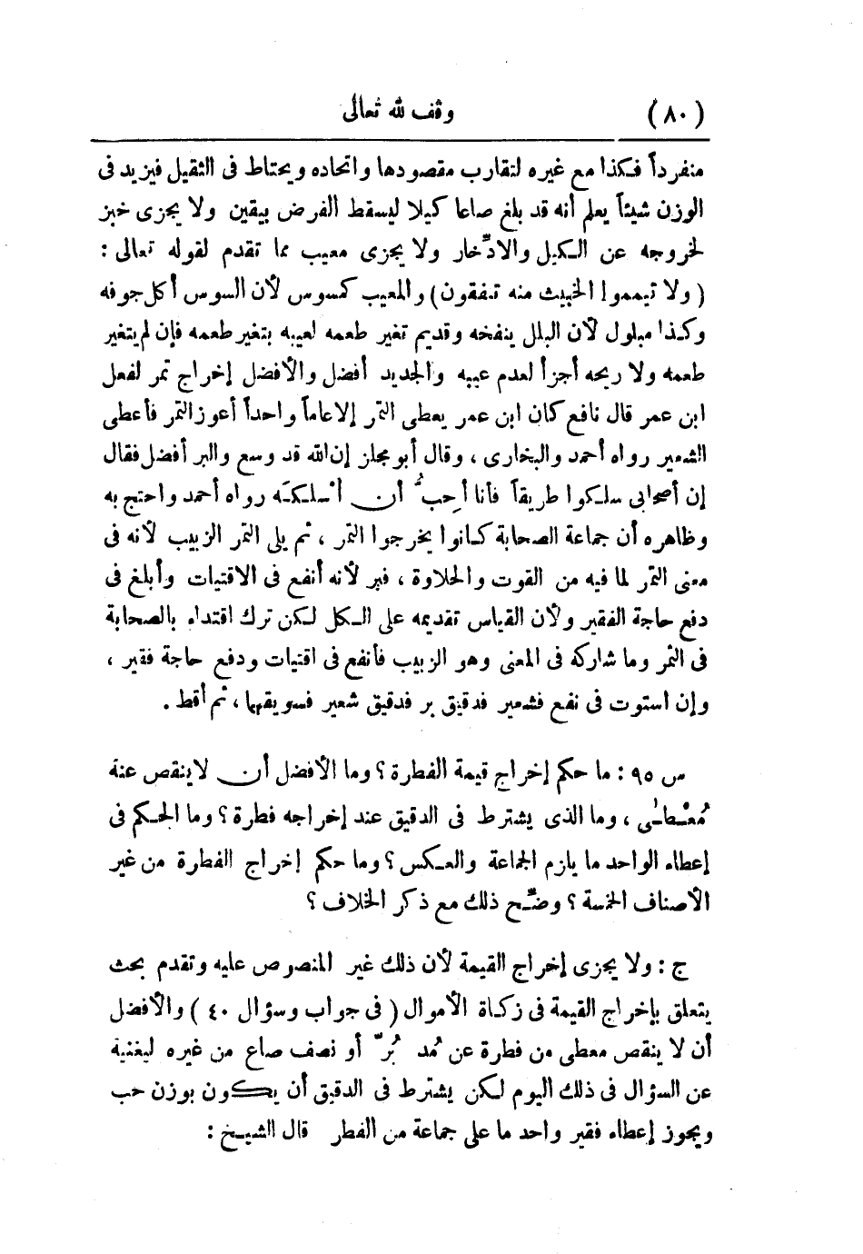ج: ولا يجزي إخراج القيمة؛ لأن ذلك غير المنصوص عليه وتقدم بحث يتعلق بإخراج القيمة في زكاة الأموال (في جواب وسؤال 40) والأفضل أن لا ينقص معطي من فطرة عن مُد بُرّ أو نصف صاع من غيره ليغنيه عن السؤال في ذلك اليوم لكن يشترط في الدقيق أن يكون بوزن حب ويجوز إعطاء فقير واحد ما على جماعة من الفطر. قال الشيخ: