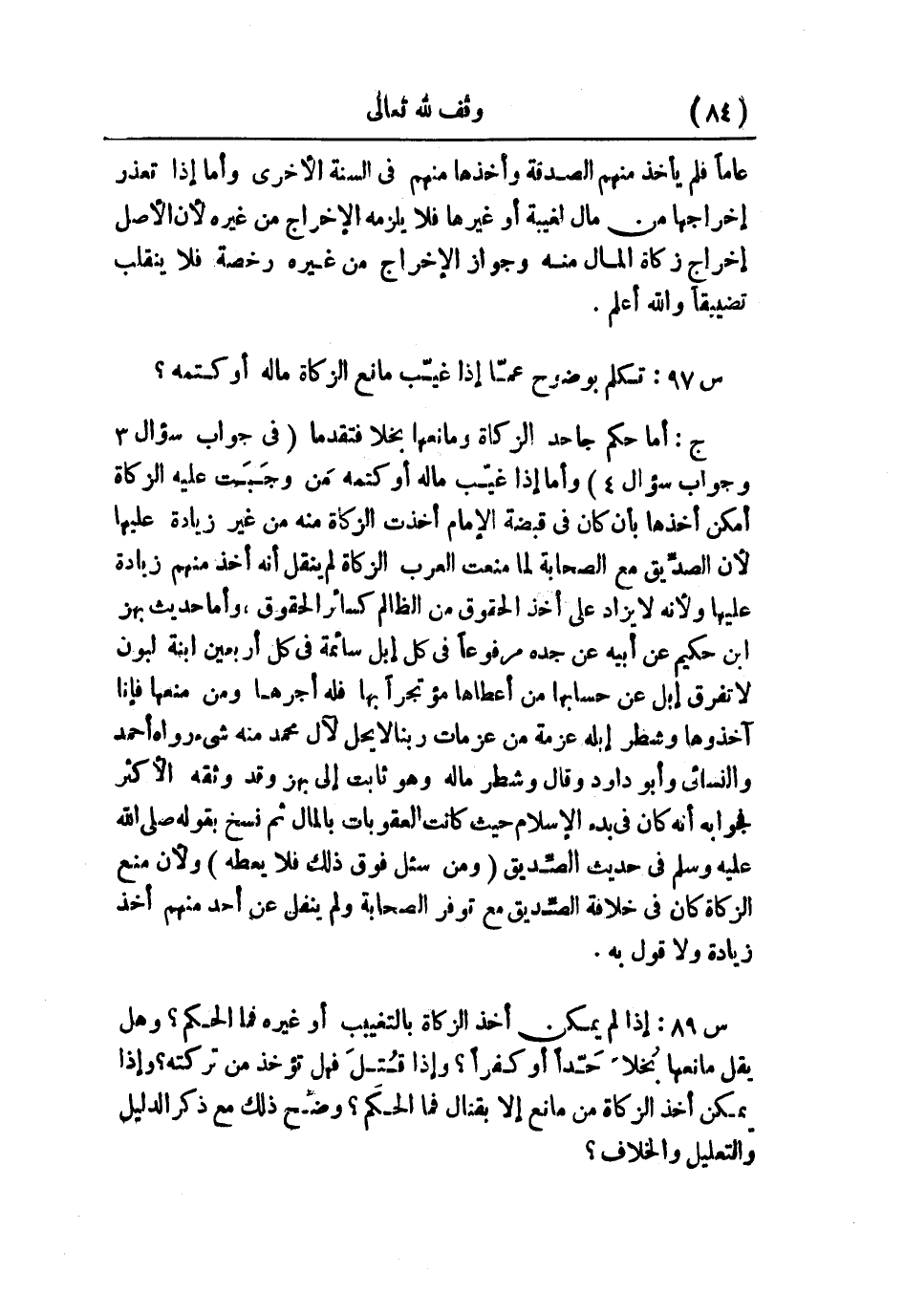 ج: أما حكم جاحد الزكاة ومانعها بخلاً فتقدما (في جواب سؤال 3 وجواب سؤال 4) ؛ وأما إذا غيب ماله أو كتمه من وجبت عليه الزكاة أمكن أخذها بأن كان في قبضة الإمام أخذت الزكاة منه من غير زيادة عليها؛ لأن الصديق مع الصحابة لما منعت العرب الزكاة لم ينقل أنه أخذ منهم زيادة عليها؛ ولأنه لا يزاد على أخذ الحقوق من الظالم كسائر الحقوق؛ وأما حديث بهز ابن حكيم عن أبيه عن جده مرفوعًا: «في كل إبل سائمة في كل اربعين ابنة لبون لا تفرق إبل عن حسابها من أعطاها مؤتجرًا بها فله أجرها، ومن منعها فإنا آخذوها وشطر إله عزمة من عزمات ربنا لا يحل لآل محمد منه شيء» رواه أحمد والنسائي وأبو داود، وقال: وشطر ماله، وهو ثابت إلى بهز وقد وثقه الأكثر، فجوابه: أنه كان في بدء الإسلام حيث كانت العقوبات بالمال، ثم نسخ بقوله - صلى الله عليه وسلم - في حديث الصديق: «ومن سُئل فوق ذلك فلا يعطه» ولأن منع الزكاة كان في خلافة الصديق مع توفر الصحابة ولم ينفل عن أحد منهم أخذ زيادة ولا قول به.