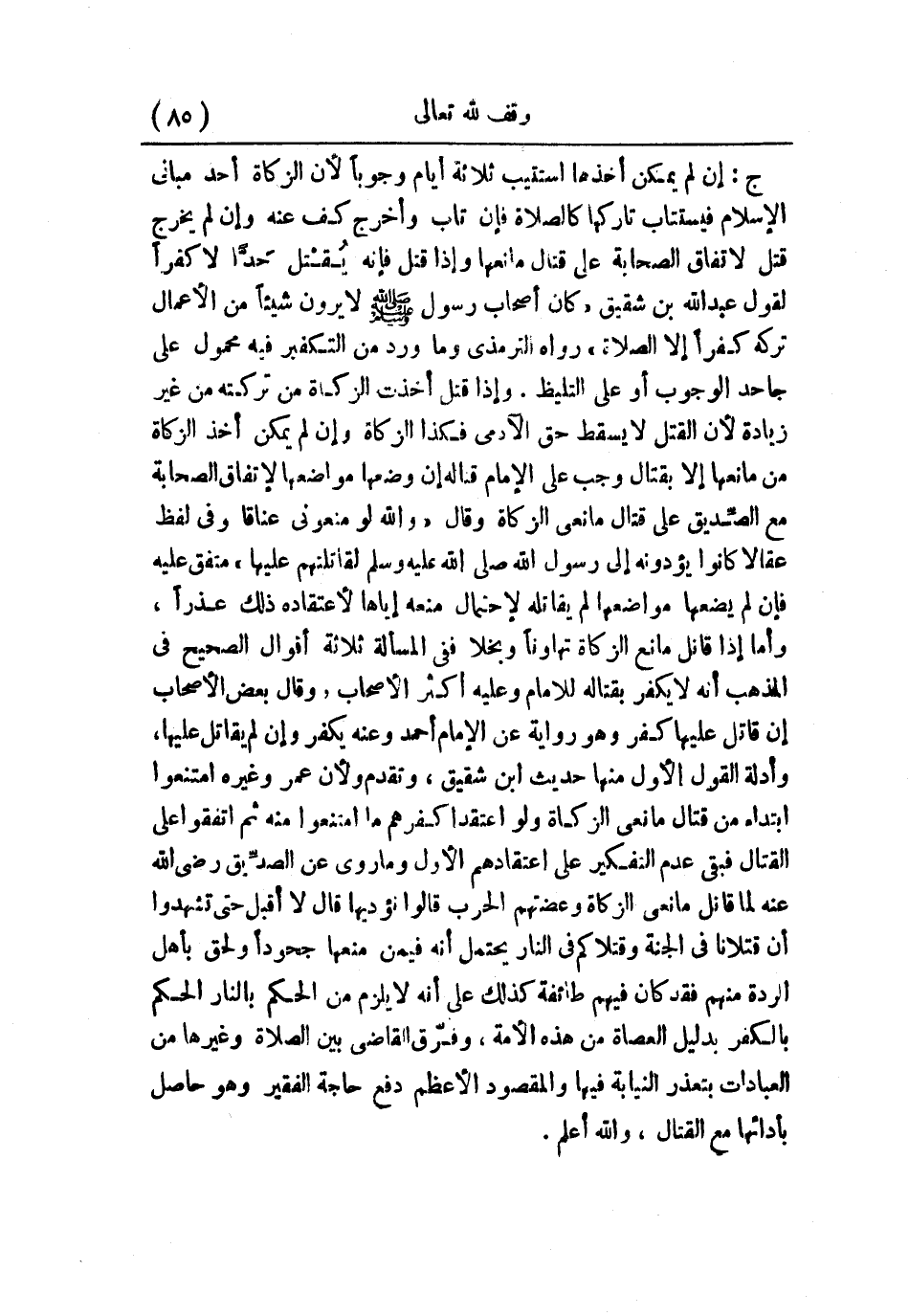 ج: إن لم يكن أخذها استتيب ثلاثة أيام وجوبًا؛ لأن الزكاة أحد مباني الإسلام فيستتاب تاركها كالصلاة؛ فإن تاب وأخرج كف عنه وإن لم يخرج قتل لاتفاق الصحابة على قتال مانعها وإذا قتل؛ فإنه يُقتل حَدًا لا كفرًا؛ لقول عبد الله بن شقيق: «كان أصحاب رسول الله - صلى الله عليه وسلم - لا يرون شيئًا من الأعمال تركه كفرًا إلا الصلاة» رواه الترمذي، وما ورد من التكفير فيه محمول على جاحد الوجوب أو على التليظ، وإذا قتل أخذت الزكاة من تركته من غير زيادة؛ لأن القتل لا يسقط حق الآدمي فكذا الزكاة، وإن لم يكن أخذ الزكاة من مانعها إلا بقتال وجب على الإمام قاله إن وضعها مواضعها لاتفاق الصحابة مع الصديق على قتال مانعي الزكاة، وقال: «والله لو منعوني عناقًا» ، وفي لفظ: «عقالاً كانوا يؤدونه إلى رسول الله - صلى الله عليه وسلم - لقاتلتهم عليها» متفق عليه؛ فإن لم يضعها مواضعها لم يقاتله لإحتمال منعه إياها لاعتقاده ذلك عذرًا، وما إذا قاتل مانع الزكاة تهاونًا وبخلاً، ففي المسألة ثلاثة أقوال الصحيح في المذهب أنه لا يكفر وهو رواية عن الإمام أحمد وعنه يكفر وإن لم يقاتل عليها، وأدلة القول الأول منها حديث ابن شقيق، وتقدم ولأن عمر وغيره امتنعوا ابتداء من قتال مانعي الزكاة ولو اعتقد اكفوهم ما امتنعوا منه، ثم اتفقوا على القتال فيبقى عدم التكفير على اعتقادهم الأول، وما روى الصديِّق - رضي الله عنه - لما قاتل مانعي الزكاة وعضتهم الحرب، قالوا: نؤديها، قال: لا أقبل حتى تشهدوا أن قتلانا في الجنة وقتلاكم في النار، يحتمل أنه فيمن منعها جحودًا ولحق بأهل الردة منهم فقد كان فيهم طائفة كذلك على أنه لا يلزم من الحكم بالنار الحكم بالكفر بدليل العصاة من هذه الأمة، وفرّق القاضي بين الصلاة وغيرها من العبادات بتعذر النيابة فيها، والمقصود الأعظم دفع حاجة الفقير وهو حاصل بأدائها مع القتال. والله أعلم.