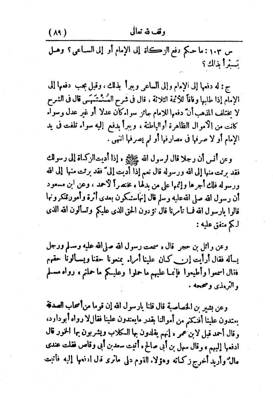 وعن أنس أن رجلاً قال لرسول الله - صلى الله عليه وسلم -: «إذا أديت الزكاة إلى رسولك فقد برئت منها إلى الله ورسوله، قال: «نعم، إذا أديت إليّ فقد برئت منها إلى الله ورسوله، فلك أجرها وإثمها على من بدلها» » مختصرًا لأحمد، وعن ابن مسعود أن رسول الله - صلى الله عليه وسلم - قال: «إنها ستكون بعدي أثرة وأمور تنكرونها» قالوا: يا رسول الله، فما تأمرنا؟ قال: «تؤدون الحق الذي عليكم وتسألون الله الذي لكم» متفق عليه.