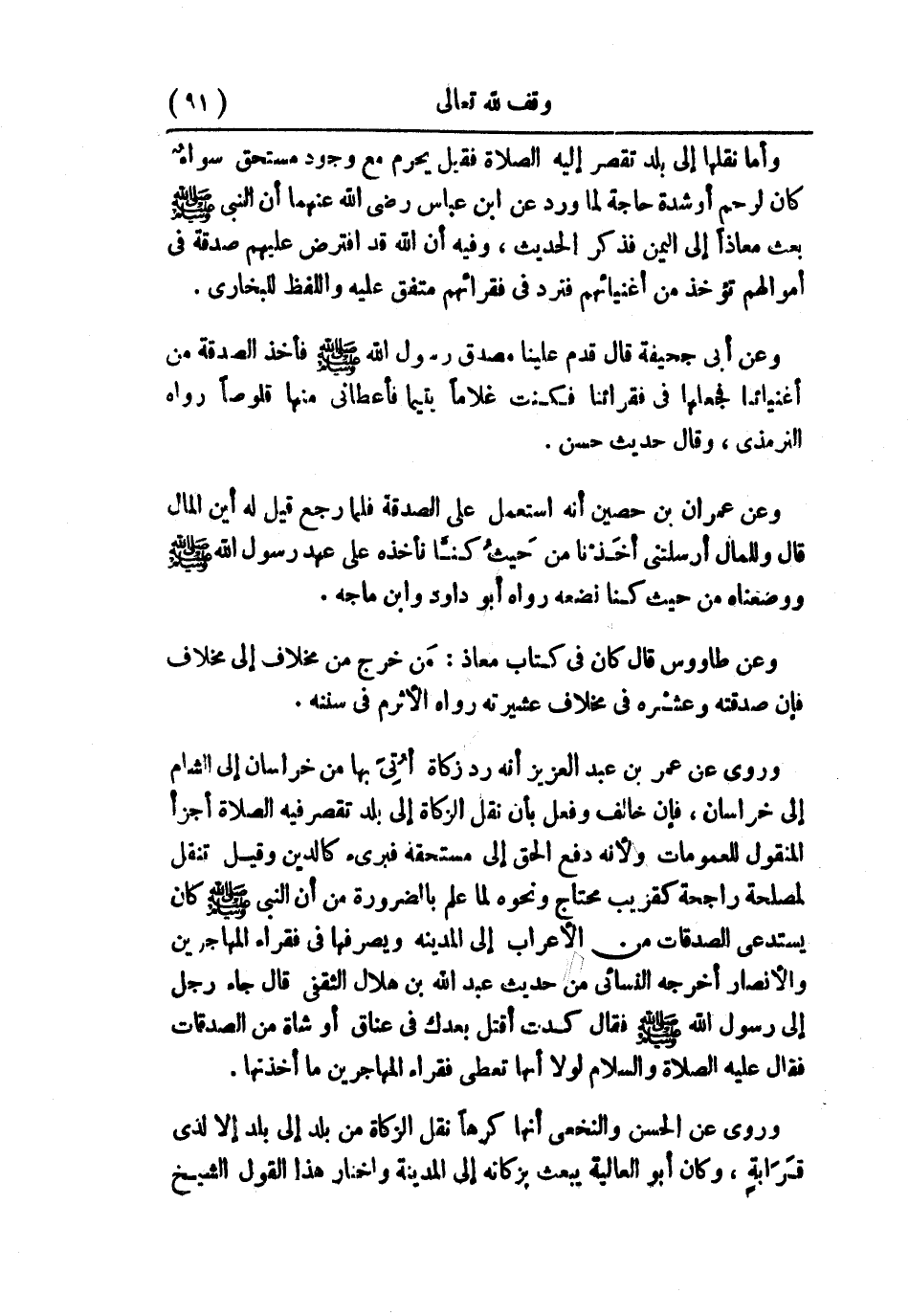 وروي عن عمر بن عبد العزيز أنه رد زكاة أُتي بها من خراسان إلى الشام إلى خراسان؛ فإن خالف وفعل بأن نقل الزكاة إلى بلد تقصر فيه الصلاة أجزأ المنقول للعمومات؛ ولأنه دفع الحق إلى مستحقه فبرئ كالدين، وقيل: تنفل لمصلحة راجحة كقريب محتاج ونحوه لما علم بالضرورة من «أن النبي - صلى الله عليه وسلم - كان يستدعي الصدقات من الأعراق إلى المدينة ويصرفها في فقراء المهاجرين والأنصار» أخرجه النسائي من حديث عبد الله بن هلال الثقفي، قال: جاء رجل إلى رسول الله - صلى الله عليه وسلم -، فقال: كدت أقتل بعدك في عناق أو شاة من الصدقات، فقال –عليه الصلاة والسلام-: «لولا أنها تعطي فقراء المهاجرين ما أخذتها» .